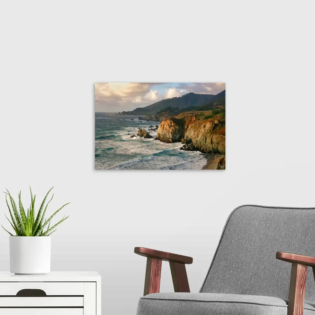The ocean meets a spectacular rock formation near Rocky Creek Bridge in Big Sur, and the teals and blues of the water contrast with the warm sunset colors of the granite and coastal plants. Michael Lynberg's stunning works of photo-impressionism capture the breathtaking California coastline in unique and captivating ways, adding beauty and inspiration to the collector's home.