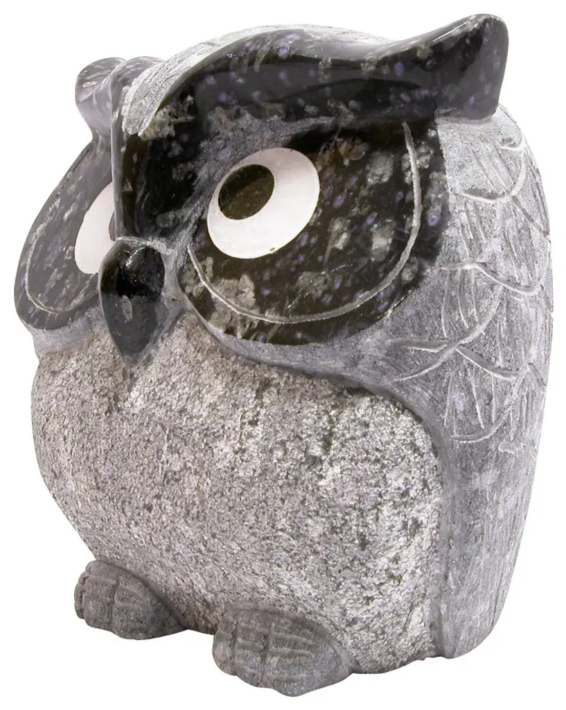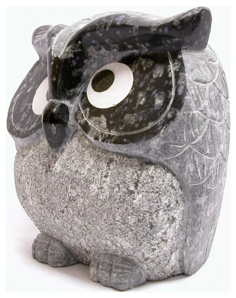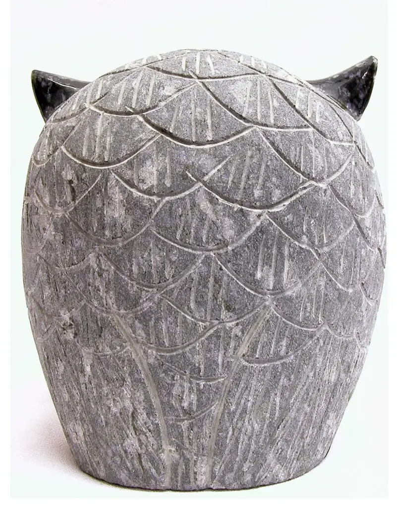 Inspired by northern hawk owl, this owl is hand carved and polished on black gray granite to mimic the natural owl feather color. He is a whimsical display for both indoors and outdoors.