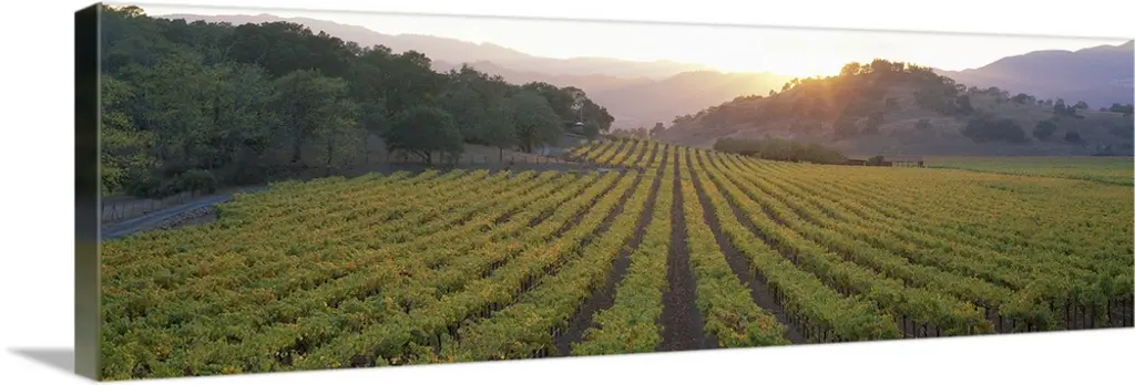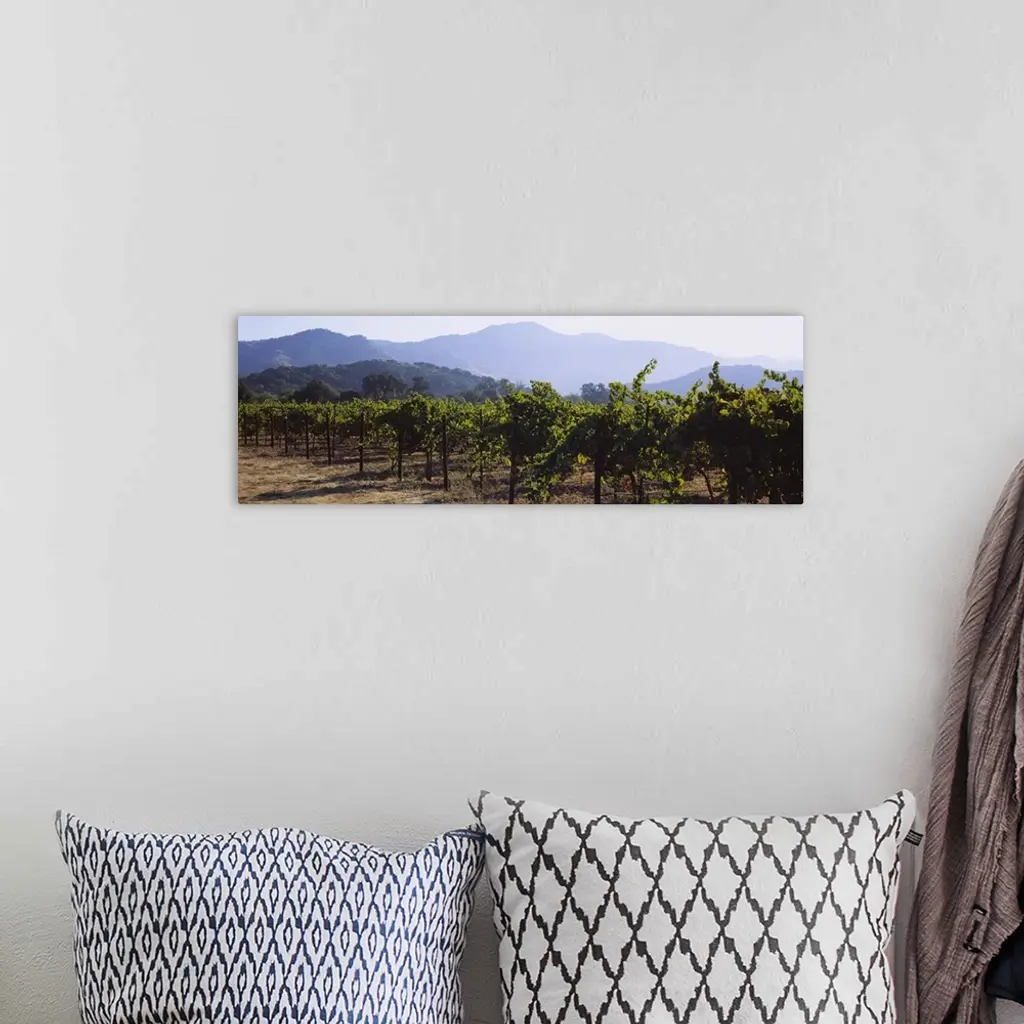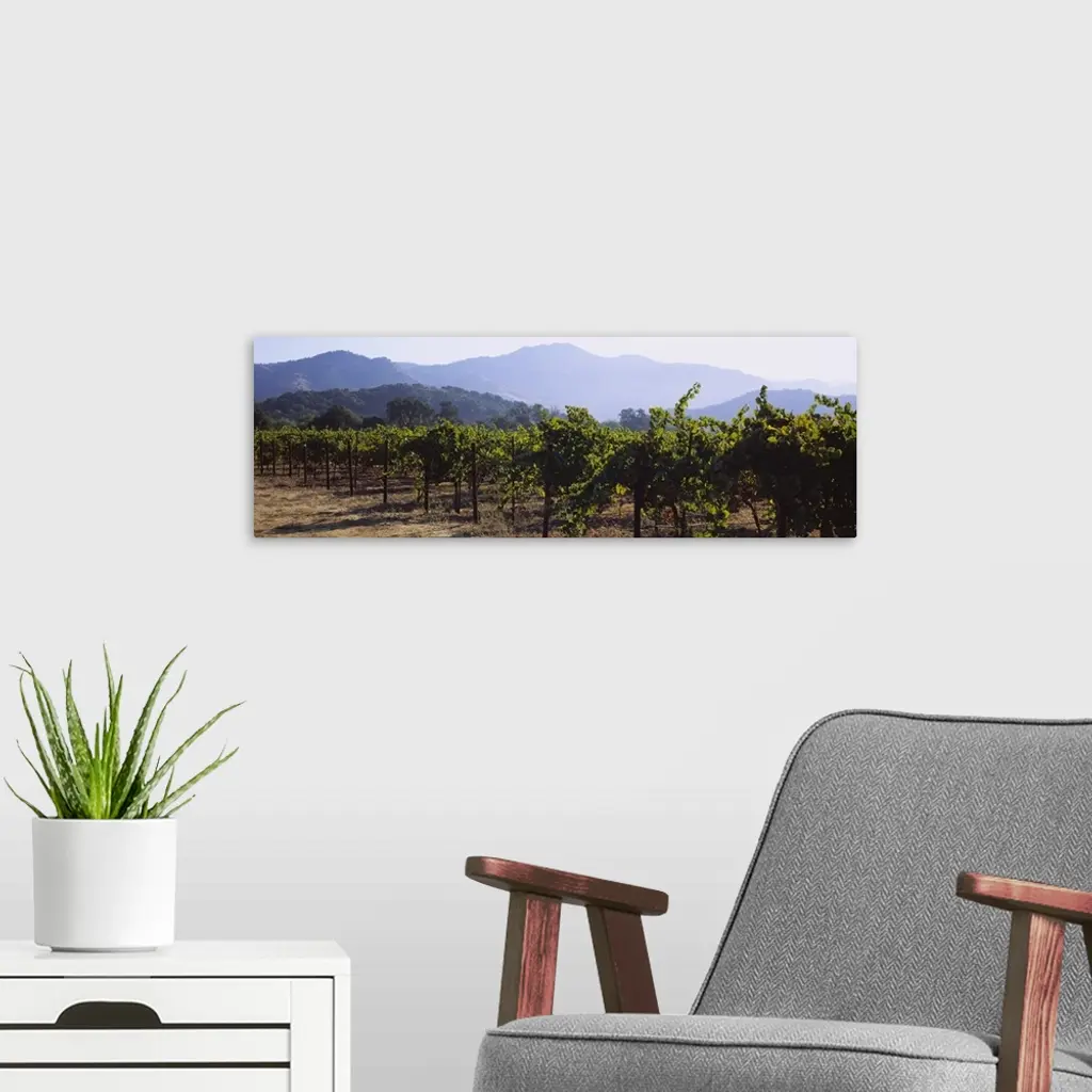 Landscape, large photograph of rows of grape vines in a vineyard, mountains in the background, in Napa Valley, California.