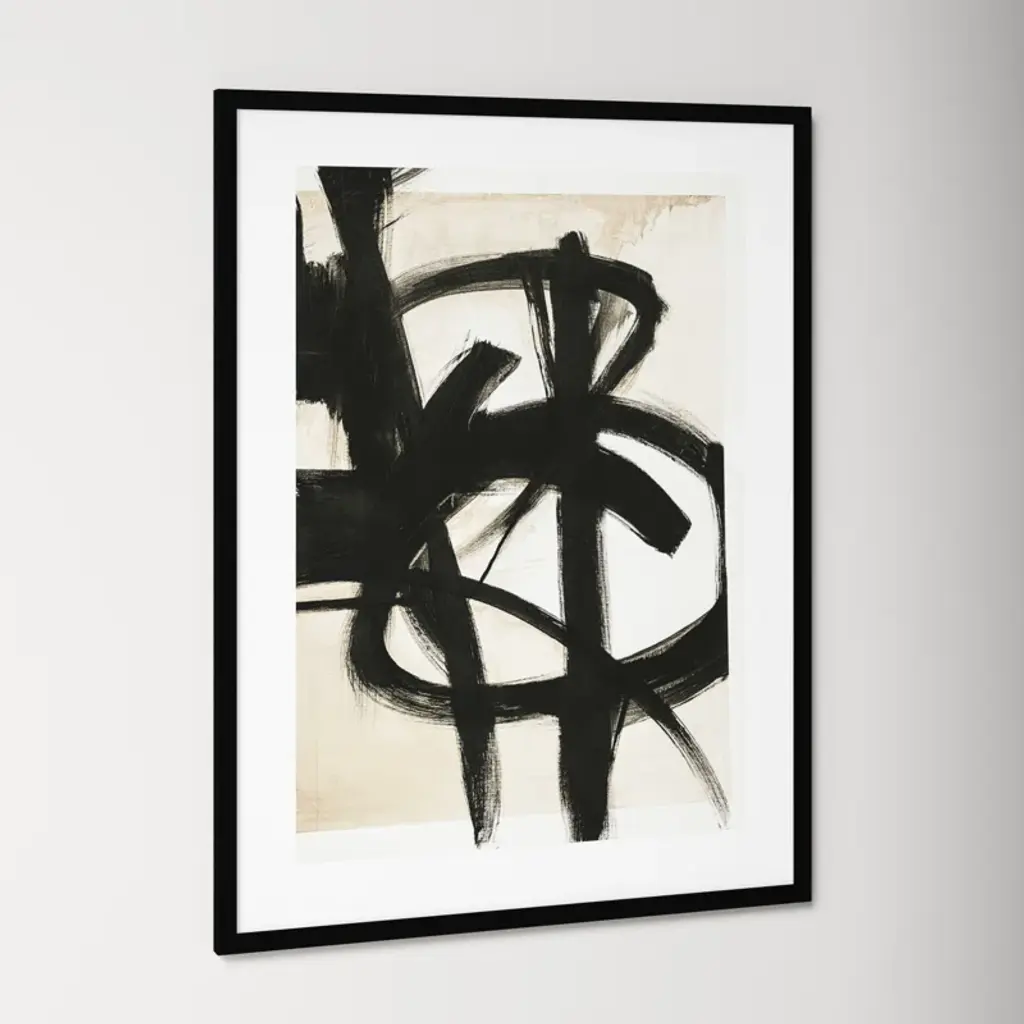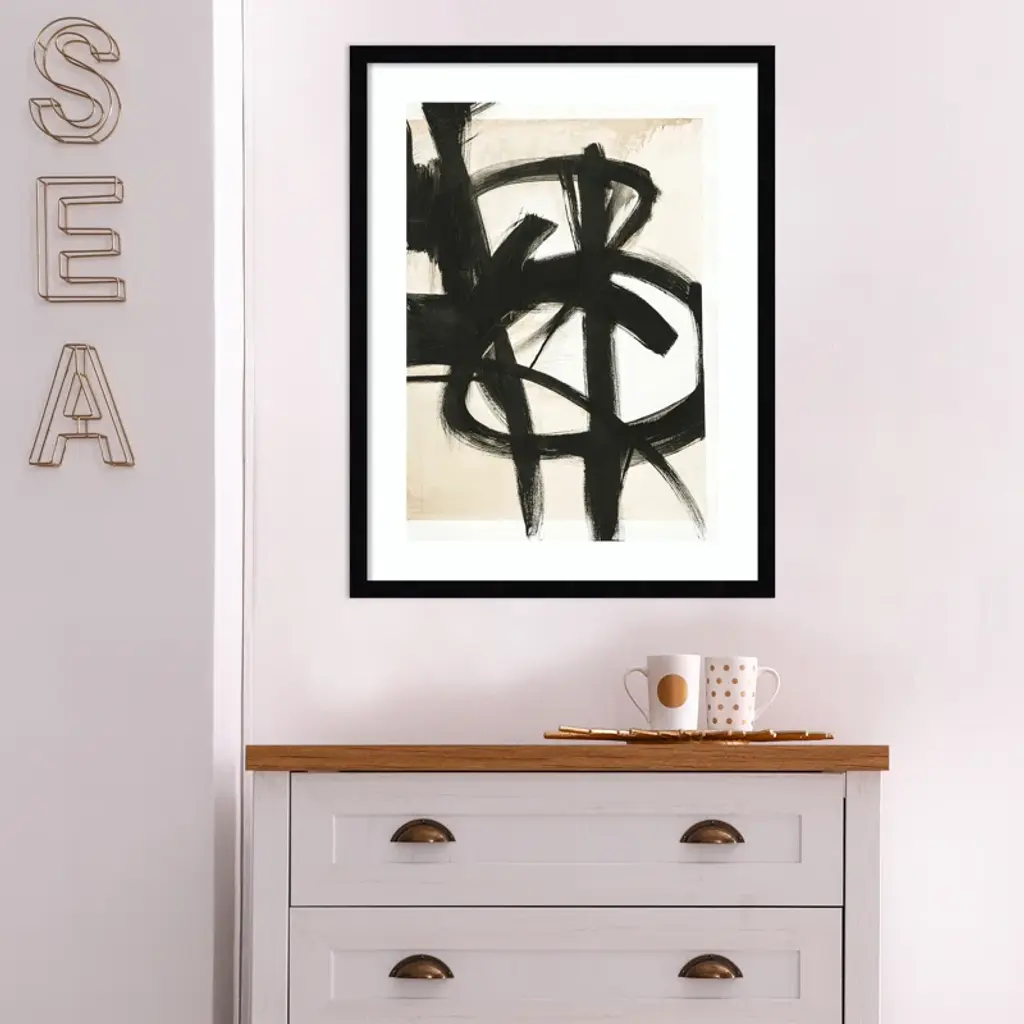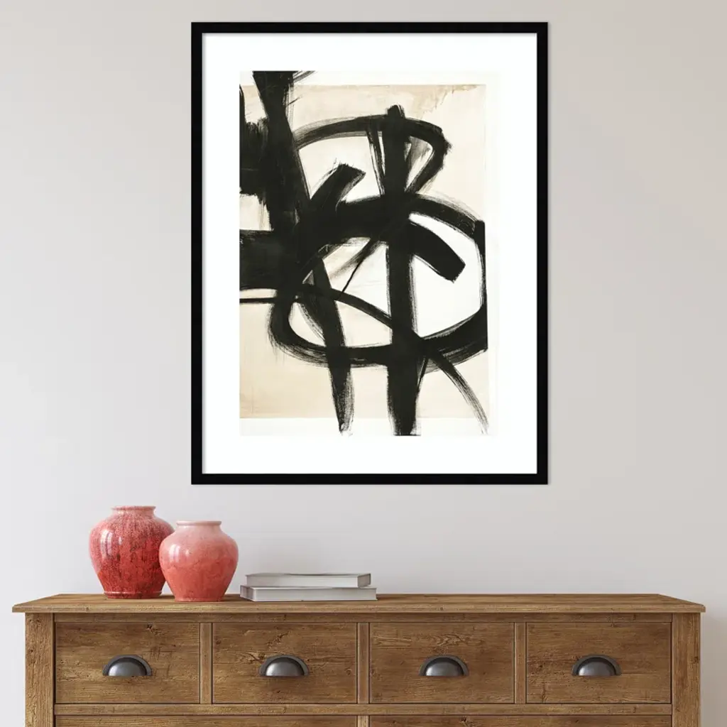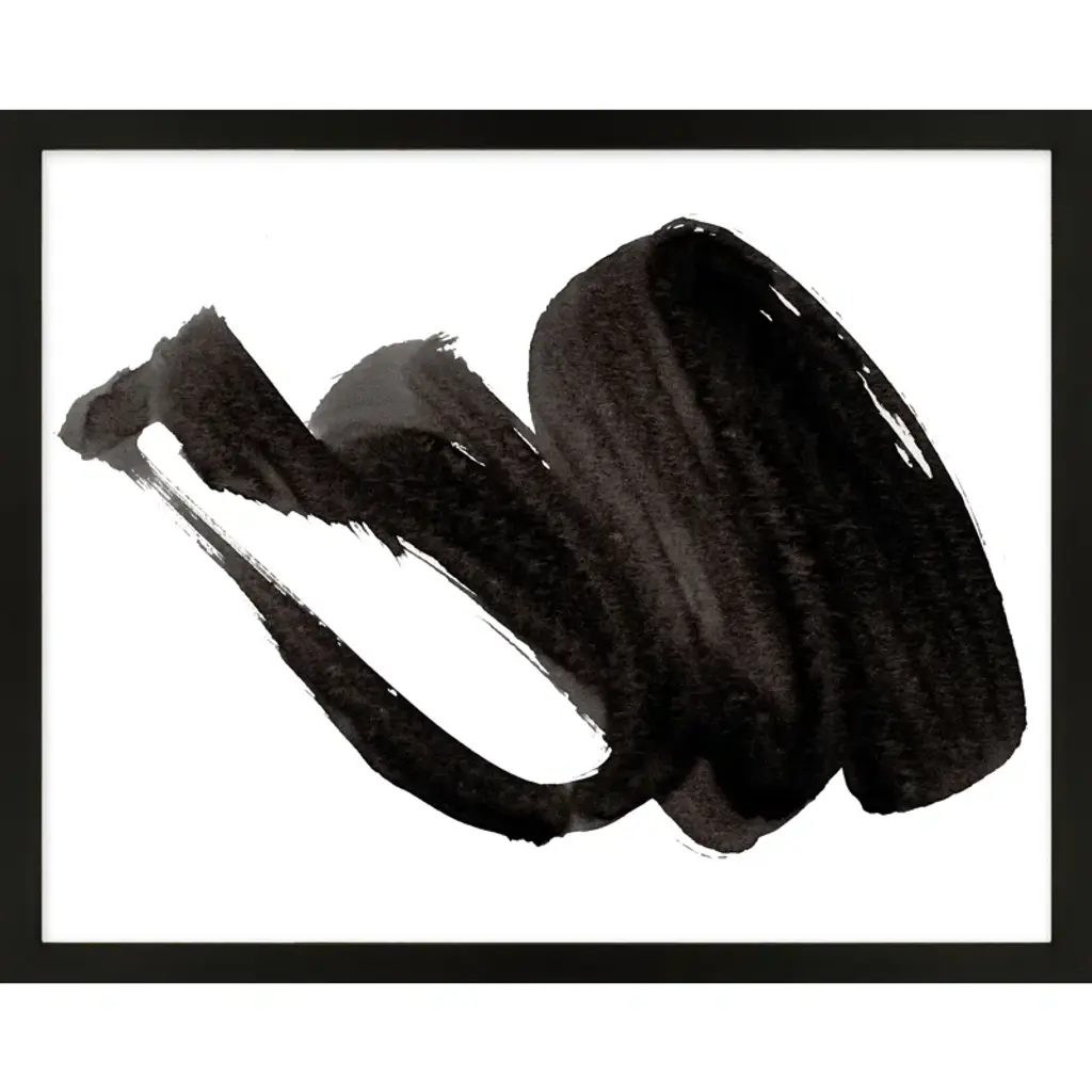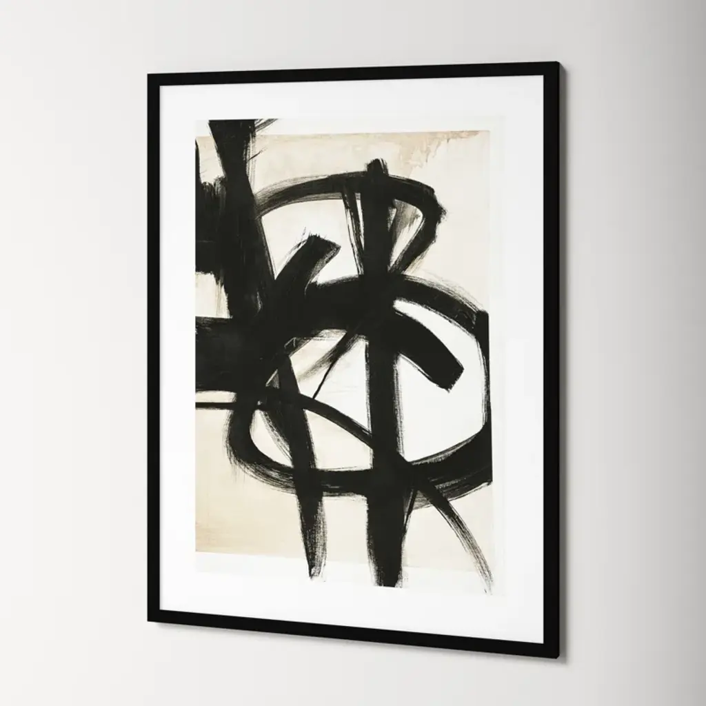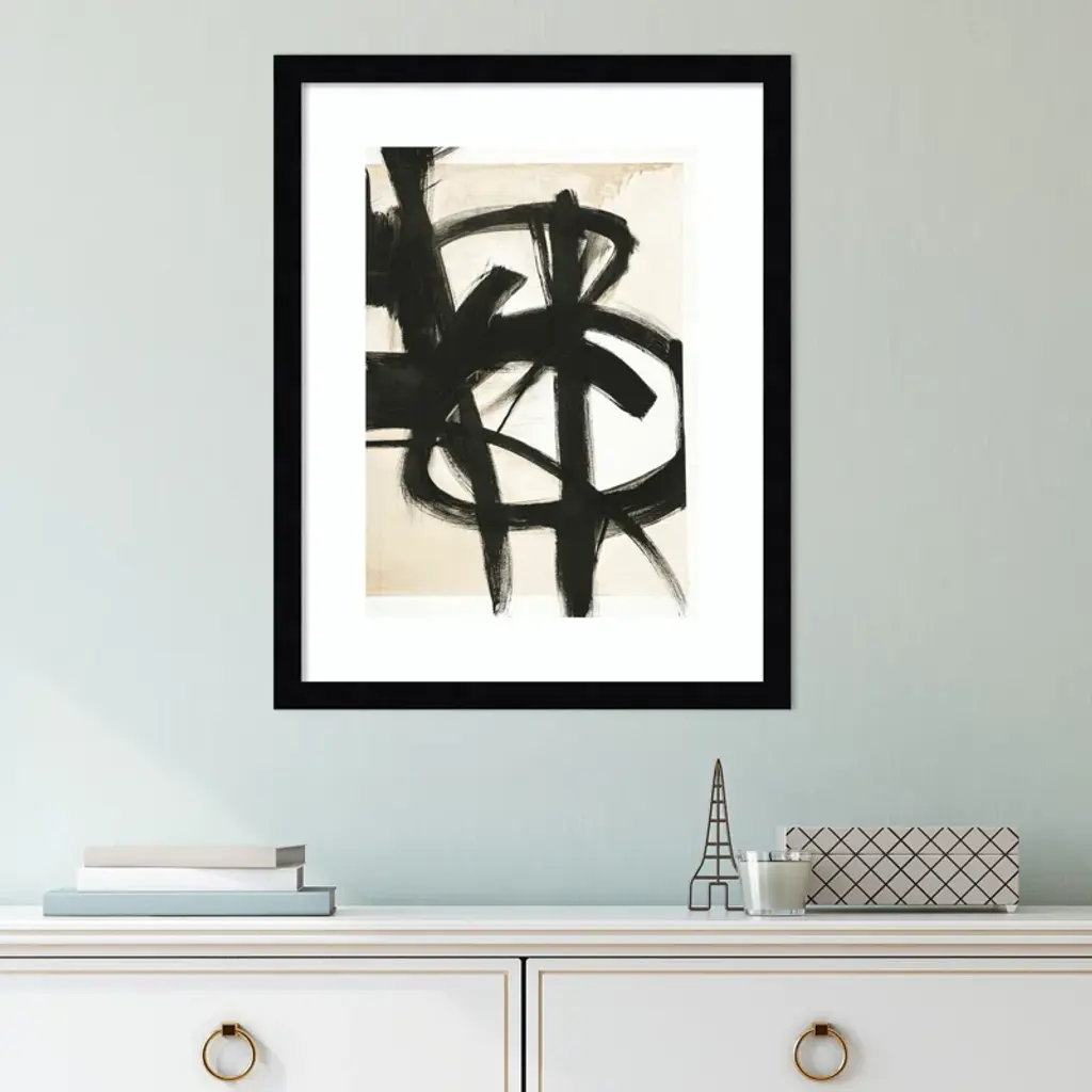 Bold brushstrokes an a neutral pattern anchor this abstract graphic art print with a dynamic, expressionist vibe. Printed in the USA, this piece features swirls of black against an off-white background, with energetic strokes that give the whole piece a sense of motion. It's giclee-printed on archival paper using fade resistant inks for an accurate, lasting reproduction of the original work. This piece is framed, matted, and includes wall mounting hardware, so it arrives ready to hang.