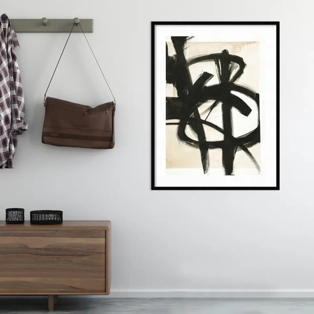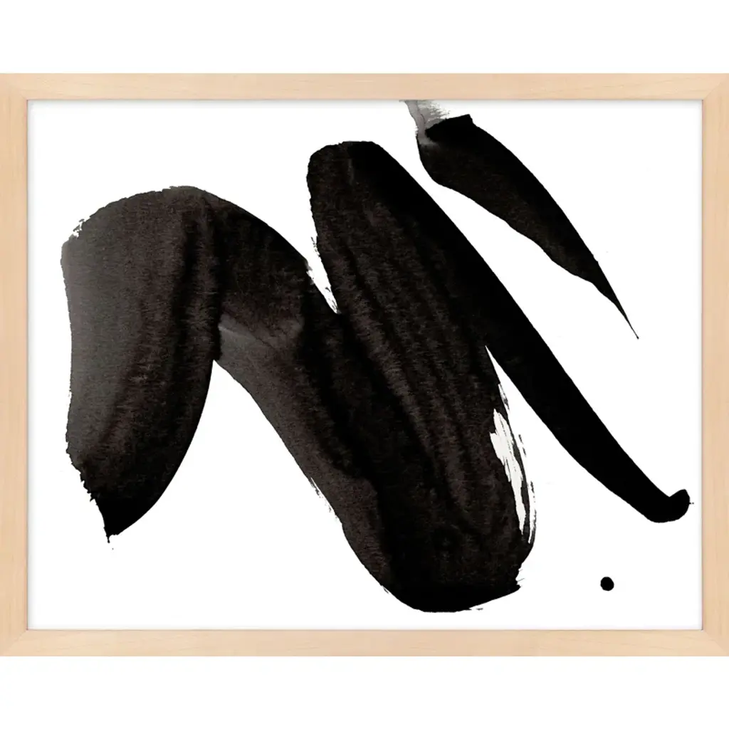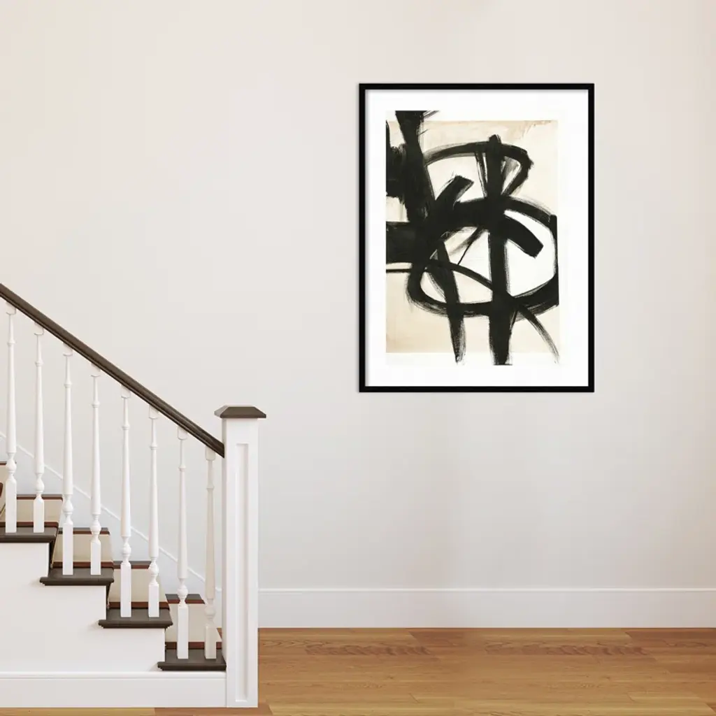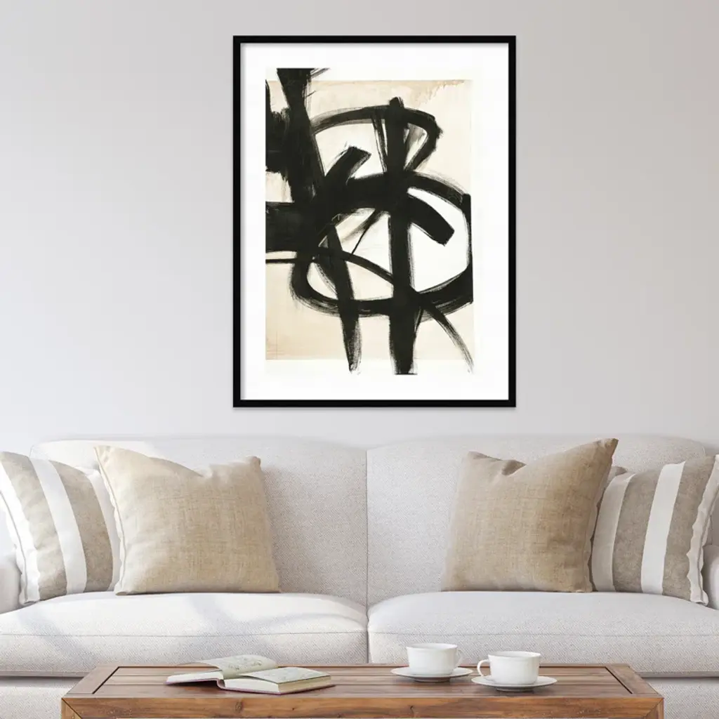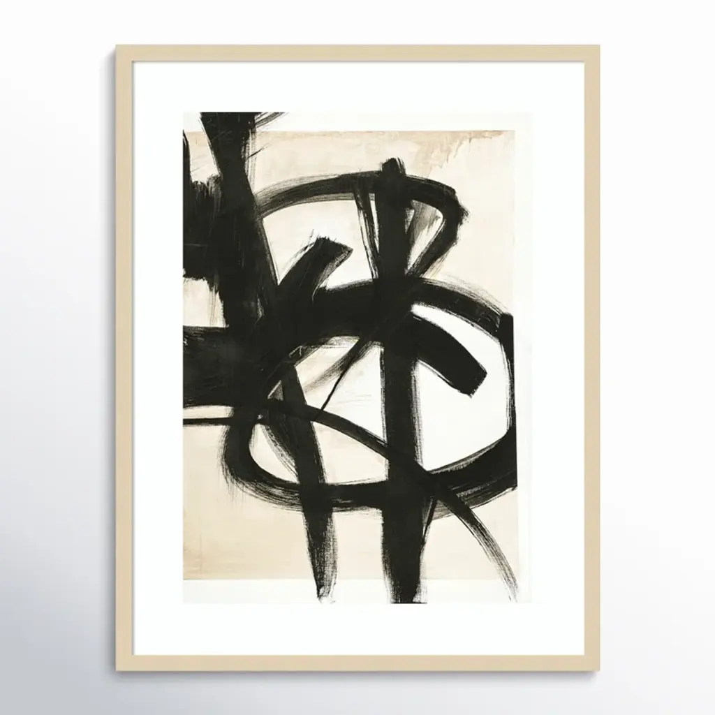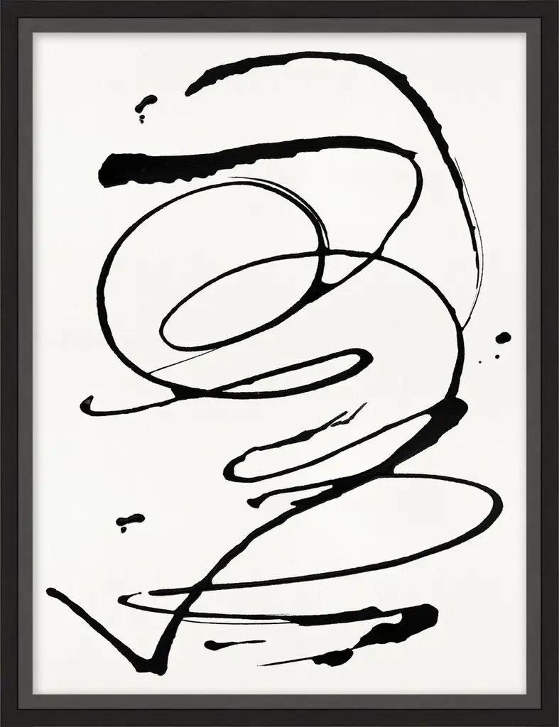 Bold brushstrokes an a neutral pattern anchor this abstract graphic art print with a dynamic, expressionist vibe. Printed in the USA, this piece features swirls of black against an off-white background, with energetic strokes that give the whole piece a sense of motion. It's giclee-printed on archival paper using fade resistant inks for an accurate, lasting reproduction of the original work. This piece is framed, matted, and includes wall mounting hardware, so it arrives ready to hang.