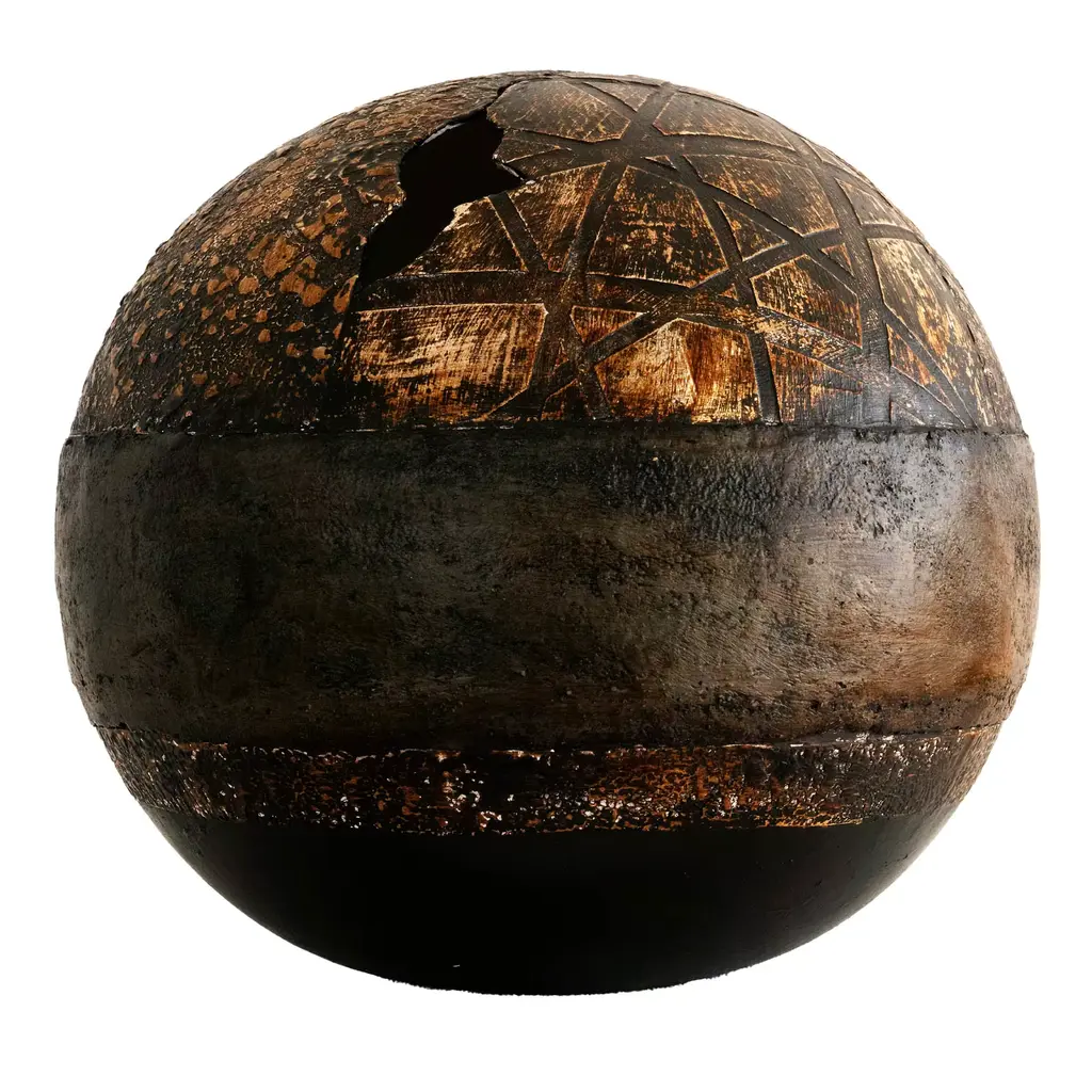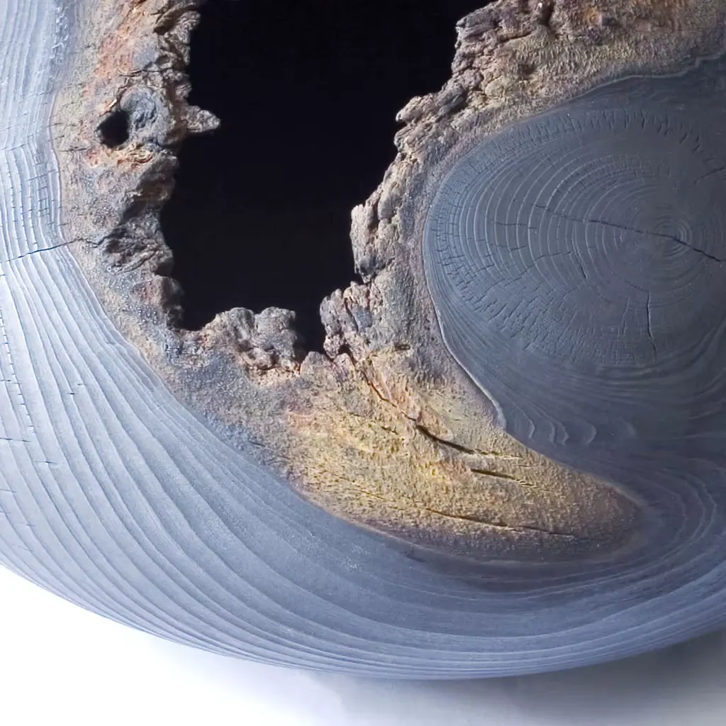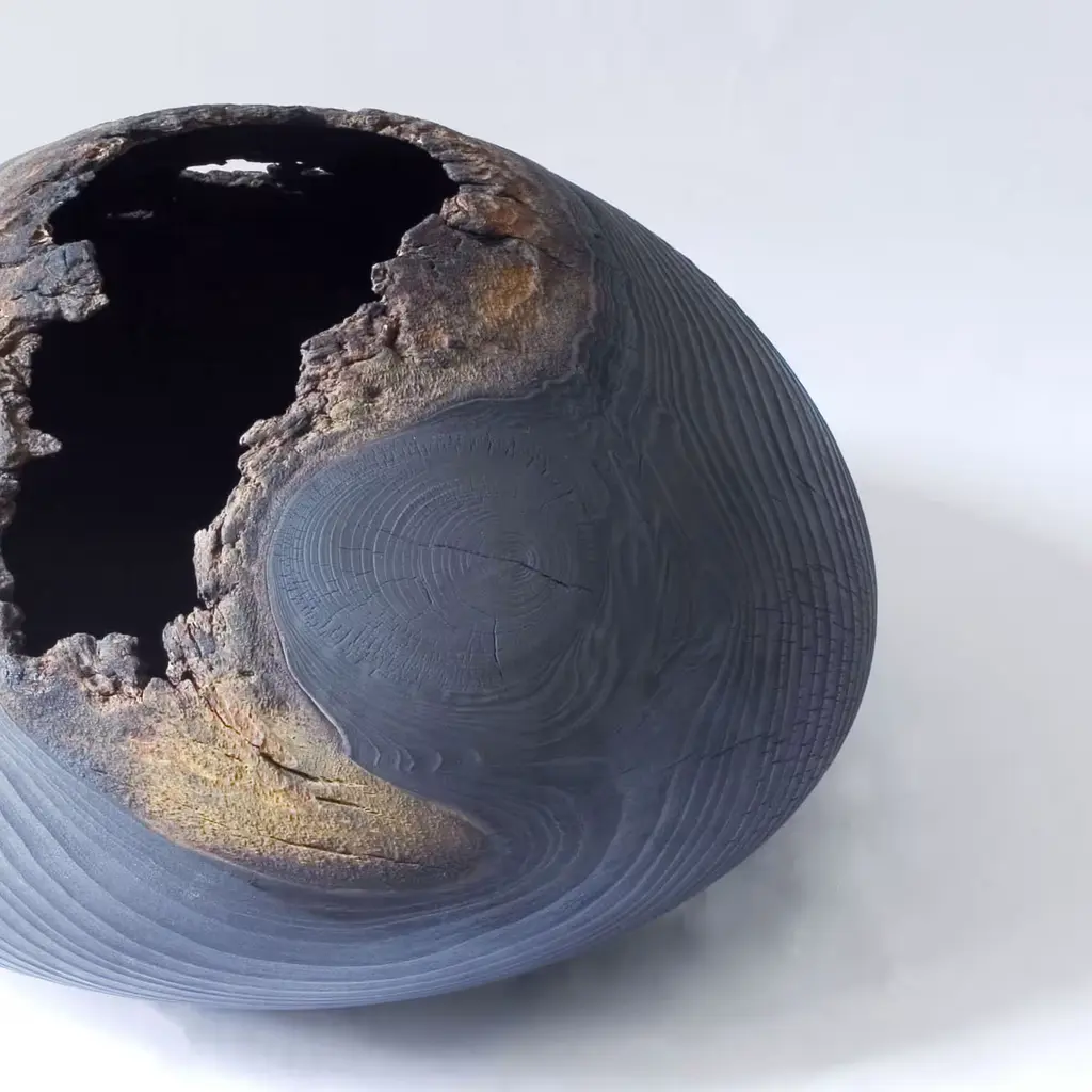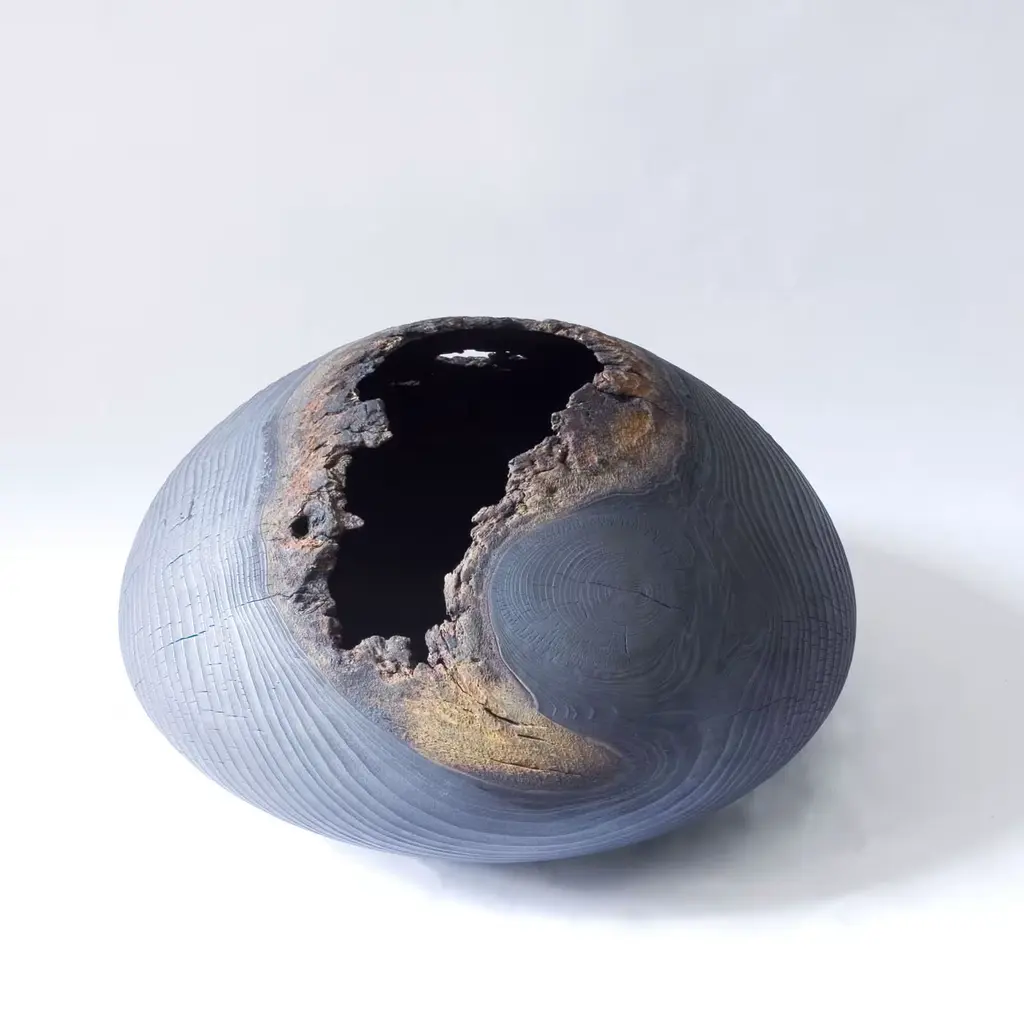Turned from a singular piece of cedar, this striking vase shows the work of nature in the delicate rings that run throughout its surface. The curves of its silhouette are enhanced by the choice of a dark color for the exterior, obtained with the use of oxides and graphite. The irregular opening that makes its mouth adds to the feeling that this is a magnificent object showing the power and allure of nature, accompanied with the expert touch of wood working.