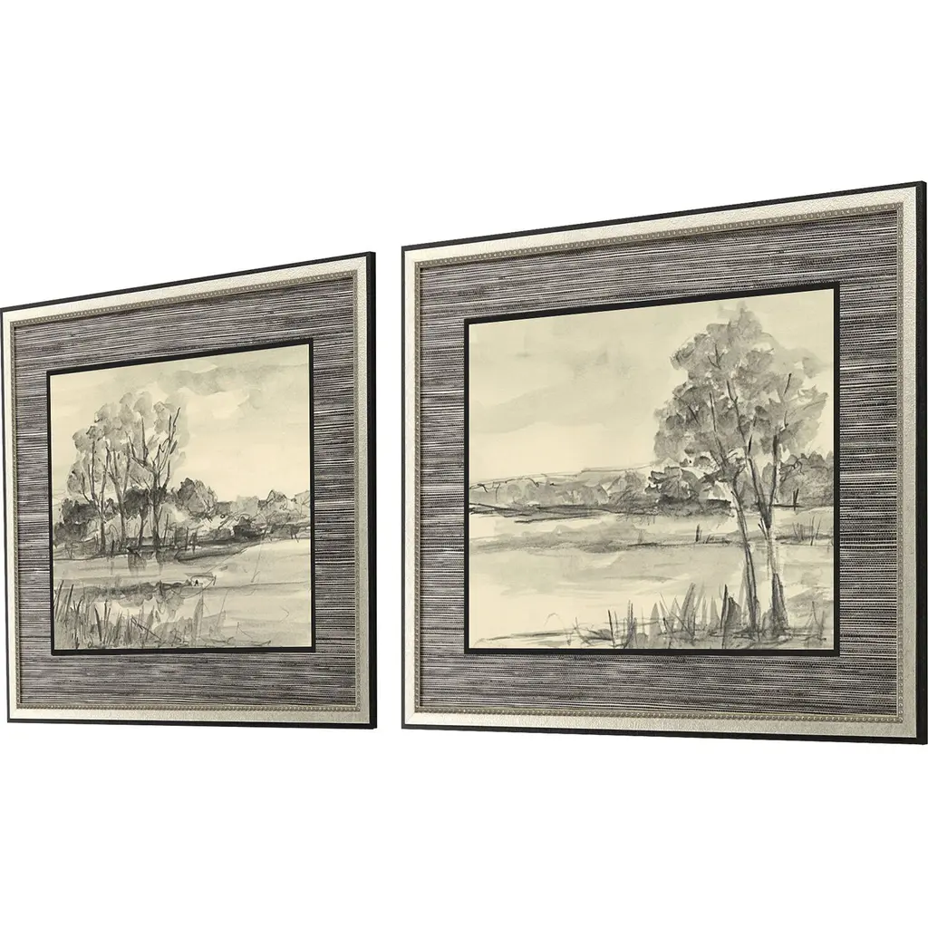 Genteel pastoral scenes feature a hand applied decorative paper. Framed in a traditional step profile wood with distressed silver and beaded lip.