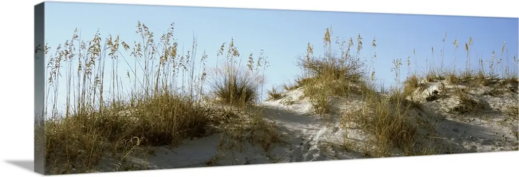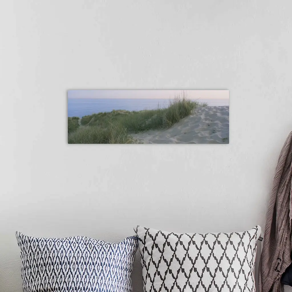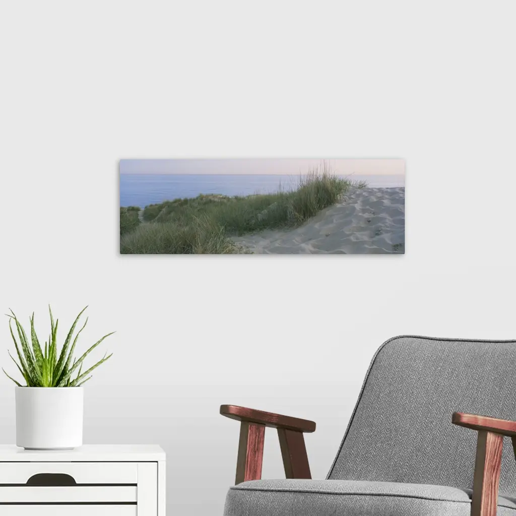 Panoramic photograph of meadow on a sand pile, with the ocean in the background.
