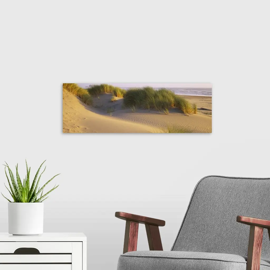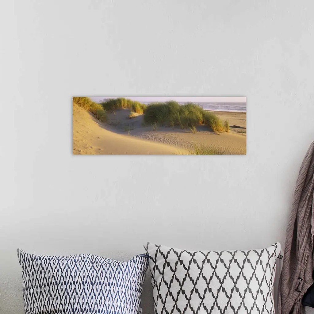 Large panoramic photograph of grass and dunes in the Bandon State Natural Area in Bandon, Oregon. The calm Pacific Ocean is visible in the background.
