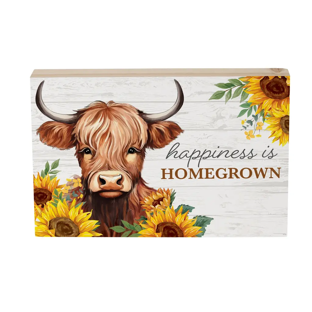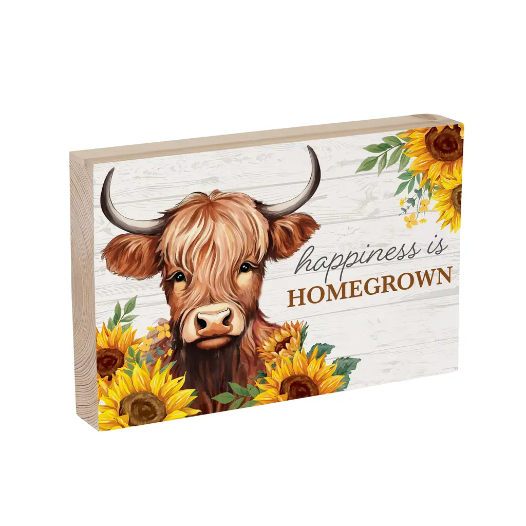 Grateful Gatherings Highland Cow And Sunflowers Wood Sign Plock, "Happiness Is Homegrown", 12"x8"