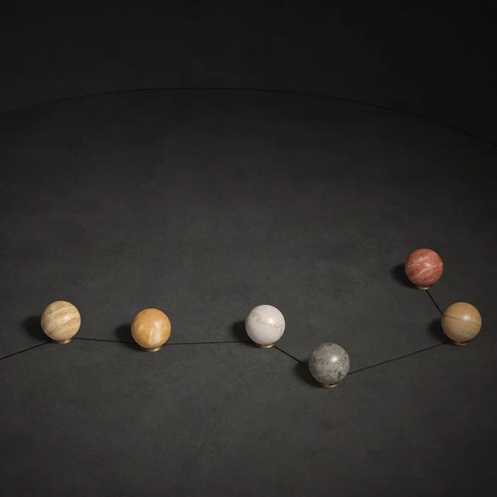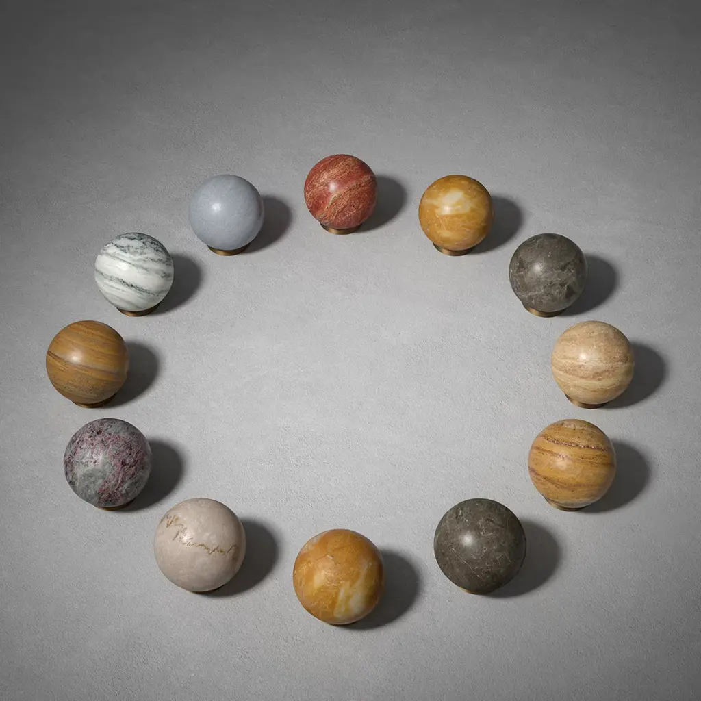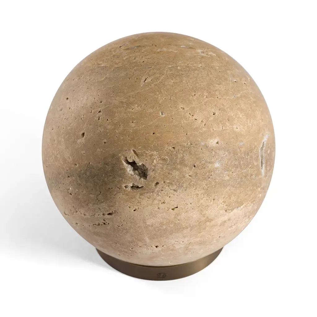 The delicate glare of the moon is delightfully rendered through the use of Aurora travertine in this one-of-a-kind paperweight. Distinguished by unrepeatable fissures ad tonal variations, the sphere can rotate on the brass base to simulate the movement of celestial bodies. Symbol of the zodiac sign Cancer associated with the moon, is impressed on the base. Placement alongside a light source is suggested for a suggestive decorative statement.