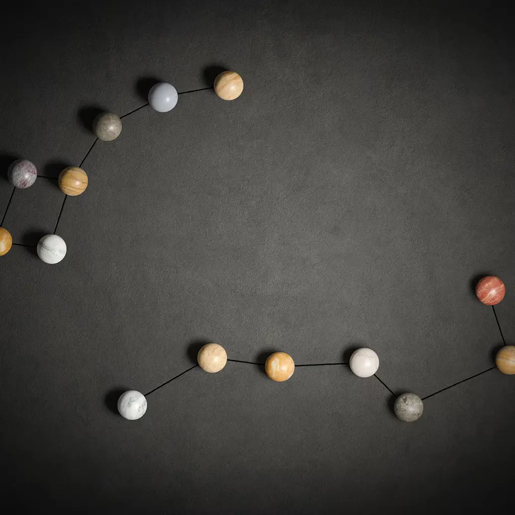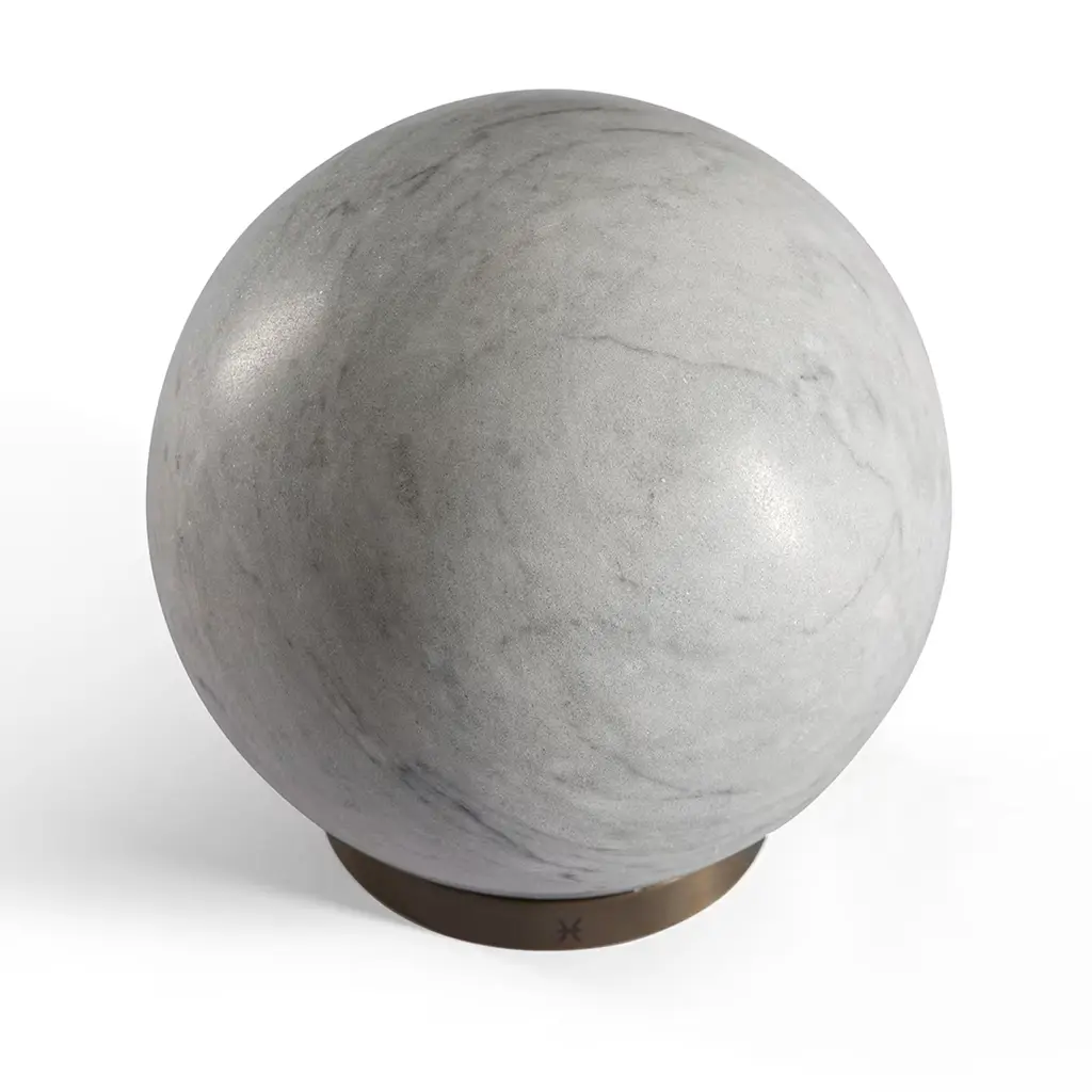 This one-off paperweight belongs to the Gravity Zodiac Collection, a series of twelve pieces celebrating the connection between planets and zodiac signs. The sphere - able to rotate on its base to simulate the movement of celestial bodies - is fashioned of Palissandro Bluette marble, a prized natural stone quarried in Italy and marked by delicate veins emerging from a gray-azure backdrop. The symbol of Pisces associated with Neptune is embossed on the brass base.