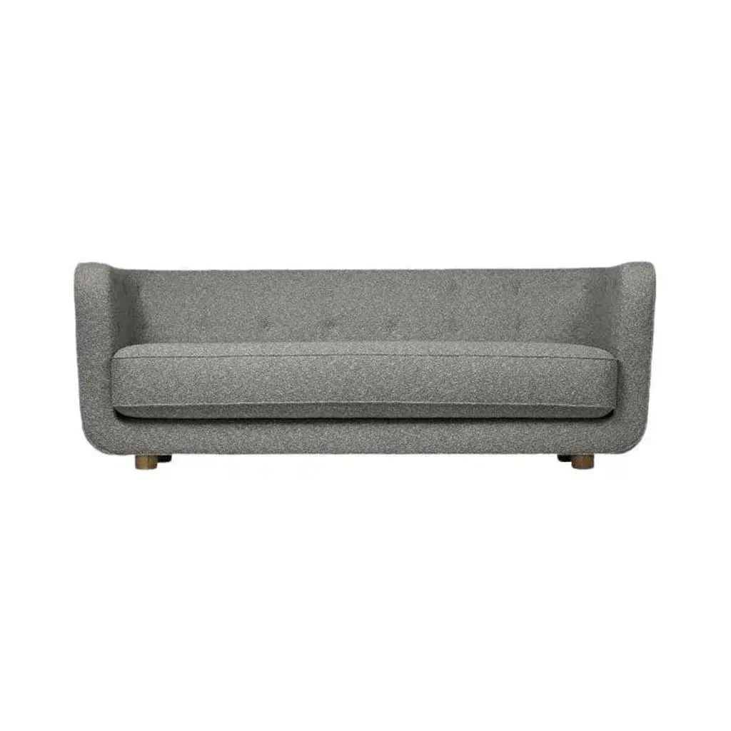 Grey and smoked oak hallingdal vilhelm sofa by lassen dimensions: w 217 x d 88 x h 80 cm materials: textile, oak. Vilhelm is a beautiful padded three-seater sofa designed by flemming lassen in 1935. A sofa must be able to function in several ways. It should invite calm and contemplation. Create a private space you can hide in and at the same time invite to life and play. It must be able to withstand sitting on the backrest or on the armrests and then it must be able to stand in the middle of the room if you want to. In addition to being aesthetically beautiful and harmonious, the design makes absolute sense in relation to these parameters.