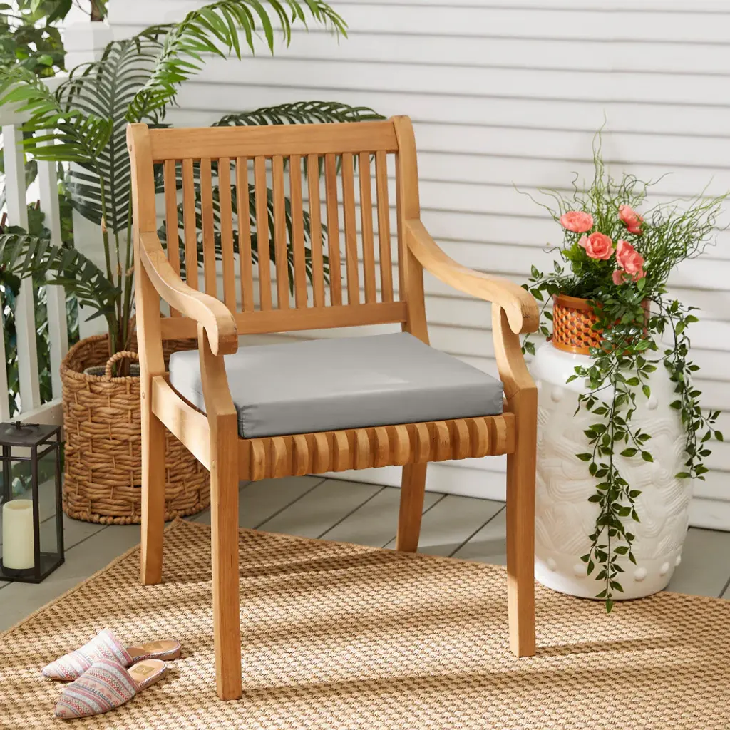 Customize a patio furnishing group with this tastefully crafted outdoor chair cushion. A beautiful neutral hue offers a base to build on as you create an attractive poolside or garden arrangement. Filled with durable, soft recycled polyester, its durable outdoor fabric cover ensures protection against sun and moisture damage to offer peace of mind for long use outdoors. Remove its cover through a zippered enclosure to launder with spot-cleaning, and secure to a chair with attached ties. Ready to coordinate and complement any colorful print or solid motif, this neutral outdoor chair cushion is a perfect fit for a casual indoor chair as well.