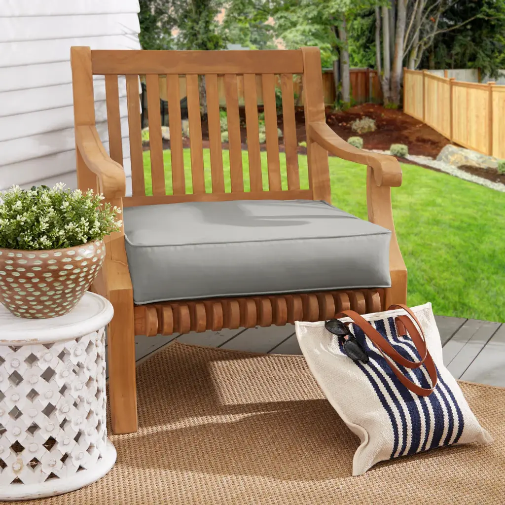 Customize a patio furnishing group with this tastefully crafted outdoor chair cushion. A beautiful neutral hue offers a base to build on as you create an attractive poolside or garden arrangement. Filled with durable, soft recycled polyester, its durable outdoor fabric cover ensures protection against sun and moisture damage to offer peace of mind for long use outdoors. Remove its cover through a zippered enclosure to launder with spot-cleaning, and secure to a chair with attached ties. Ready to coordinate and complement any colorful print or solid motif, this neutral outdoor chair cushion is a perfect fit for a casual indoor chair as well.