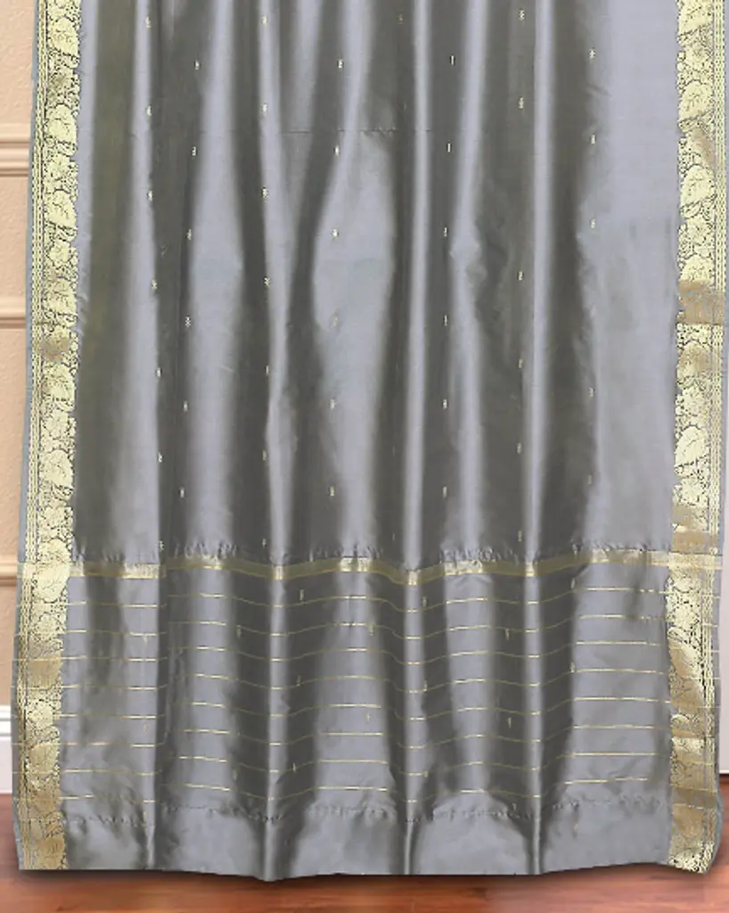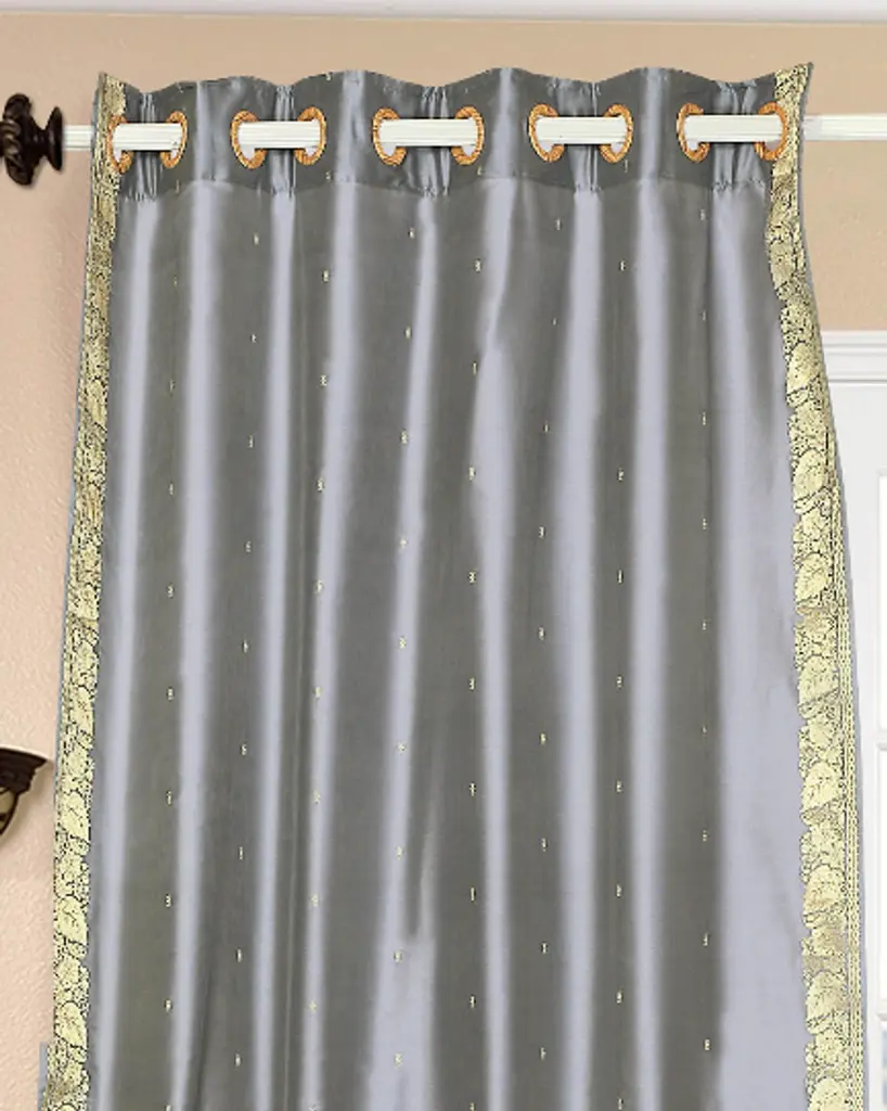 Ring-top drapery is sophisticated and contemporary. Ring-tops have decorative rings attached to the drapes. Rings create a pleated look that is crisp and modern. Sari Curtains / Drapes / Panels are the perfect choice for those looking for light, elegant drapes with a touch of luxury. It has smooth finish with a soft sheen and feels gentle and cool to the touch. Sheer curtains made of saris allow light in through windows but prevent people looking in when they are drawn. Story Behind the Art: The fabric of these curtains are weaved on a hand-loom in a small rural village in India and then hand-dyed. The artisans are a group of young hand-crafters who have moved from small villages to a big town in Central India and make various home decor items out of these exotic sari fabrics. This gives these wonderful artisans a way to have sustainable income via selling to the worldwide market on the internet. Your purchase supports local and home-based work where the artisans can easily tend to their families and pass these time-honoGray skills from one generation to the next.