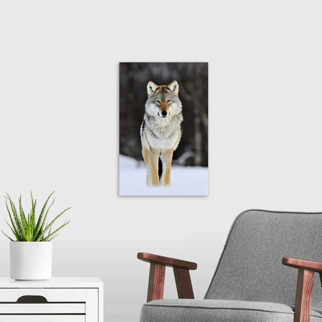 Gray Wolf (Canis lupus) standing in the snow, Norway