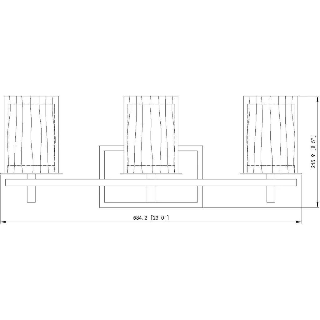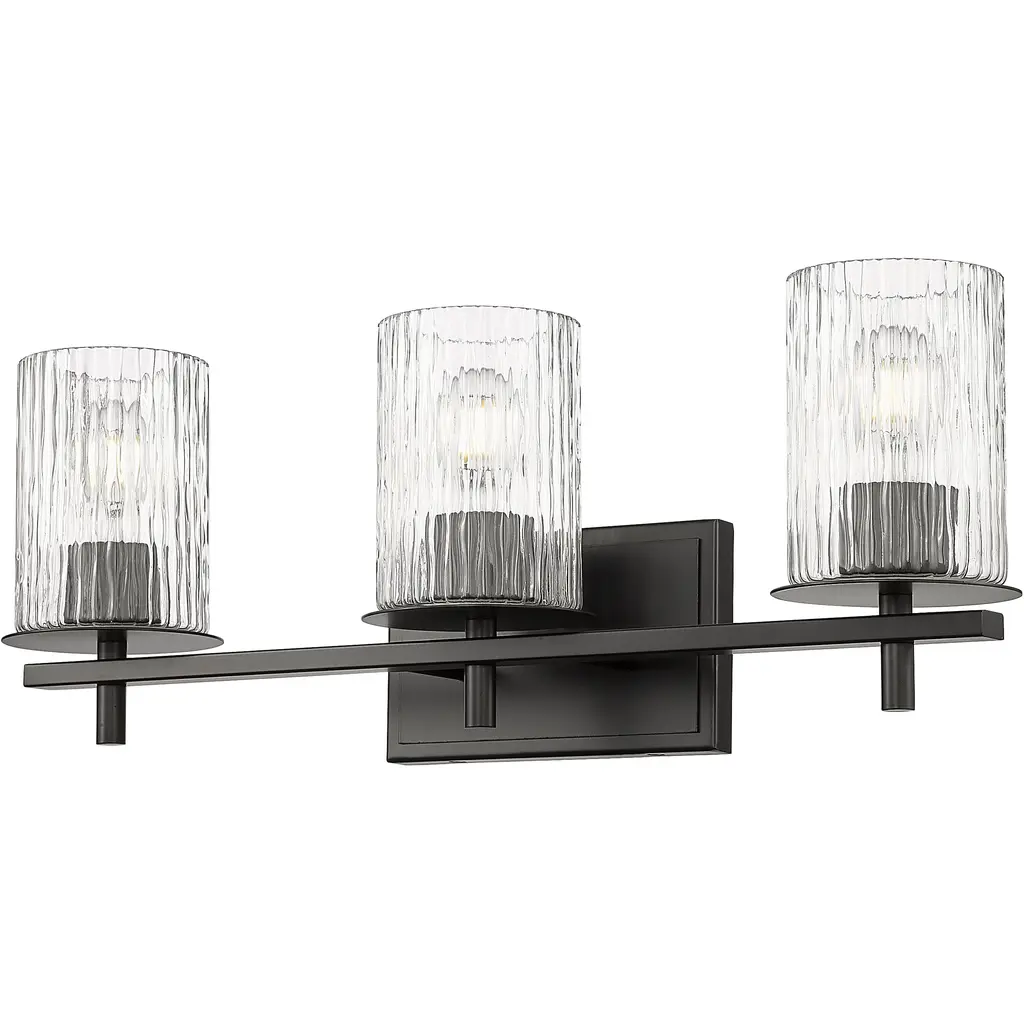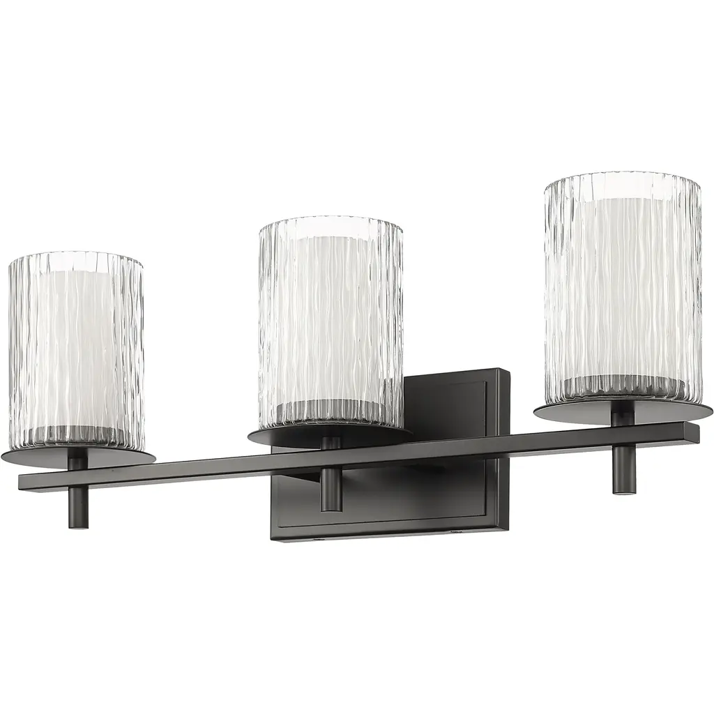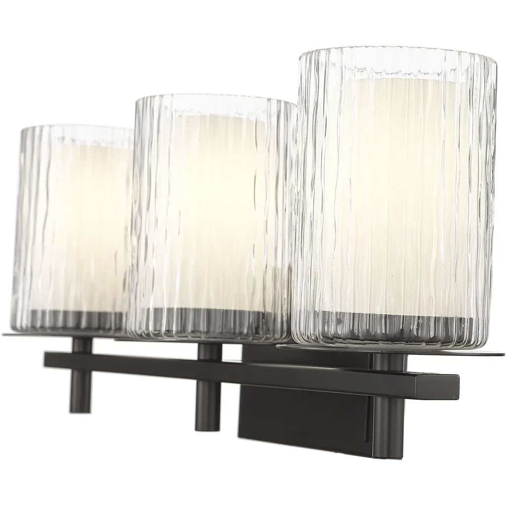 Modern with a layered design, this three-light vanity light makes a bath space come to life using sculptural elements. Intricate detail is textural and artisan with clear glasswork in a cylinder shape, with an inner white diffuser. Etched opal and clear glass blend as they enhance bold matte black finish framing and show off a crisp mix of circles and lines.