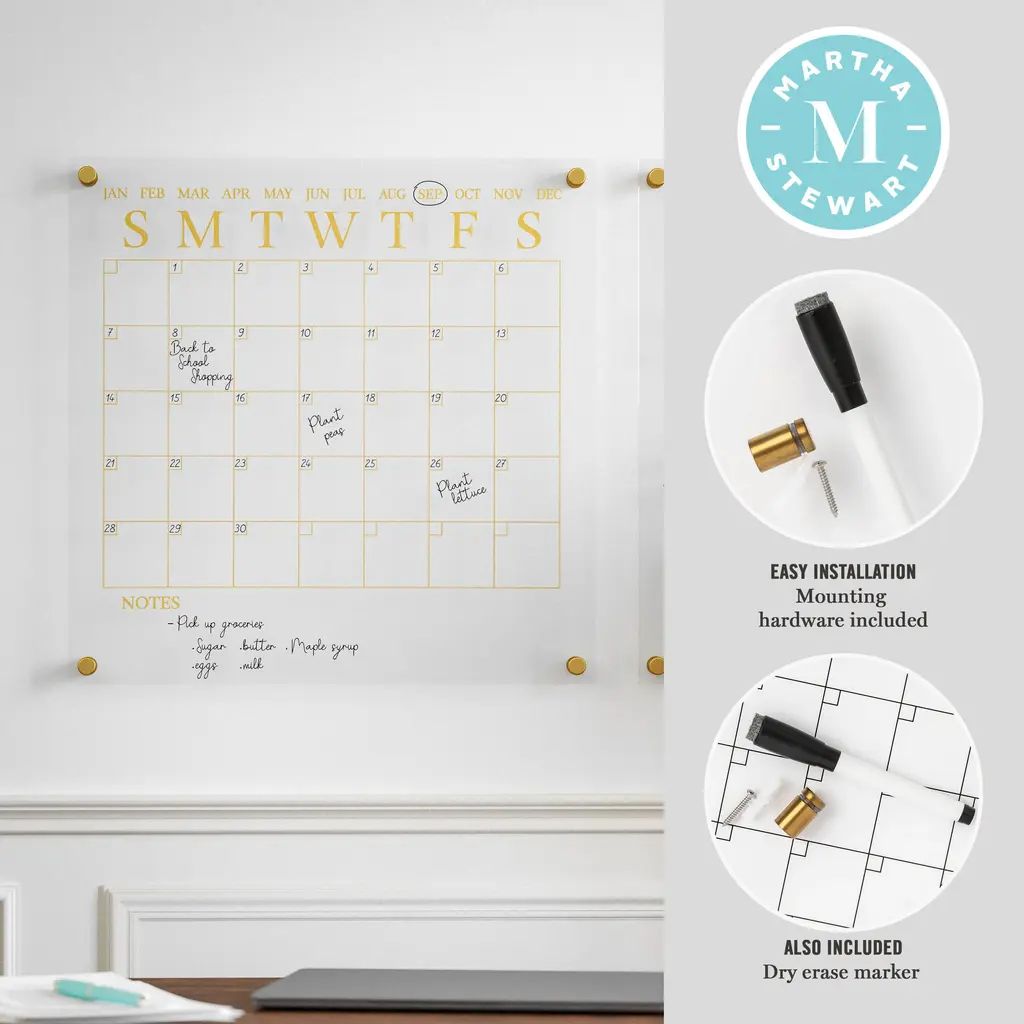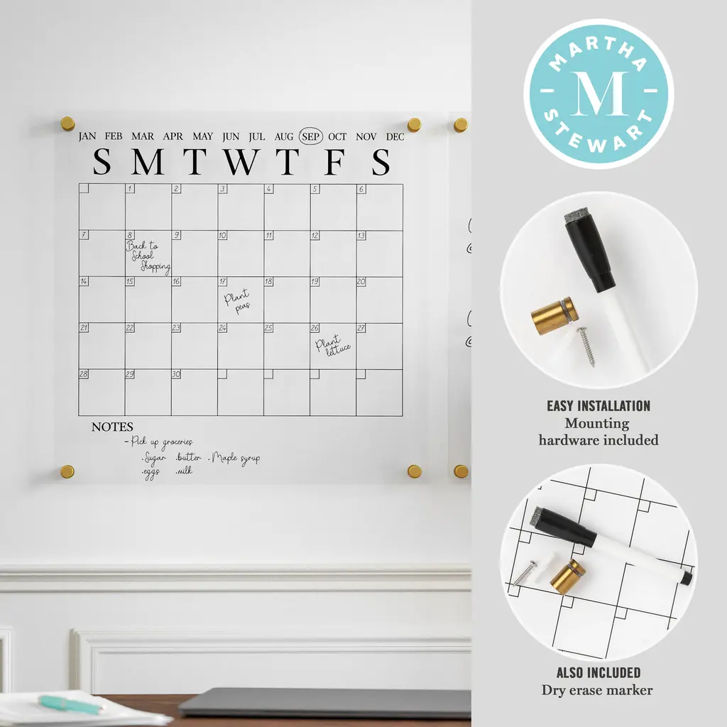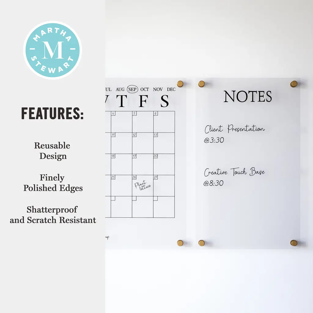 Organize your life and your desktop with the Martha Stewart Acrylic Monthly Wall Mounted Calendar and Notes Board Set. The polished edges eliminate the need for a frame while the included mounting hardware gives a dimensional appearance for a chic statement anywhere in your home. Comprised of premium crystal clear acrylic for enhanced strength and overall brightness, this wall organization set is scratch-resistant and waterproof for long-lasting use. Supplemented with a monthly blocked calendar available in 2 printed colors and a dry erase marker for adding important dates that can be wiped clean with a dry cloth and repopulated at the start of each new month.