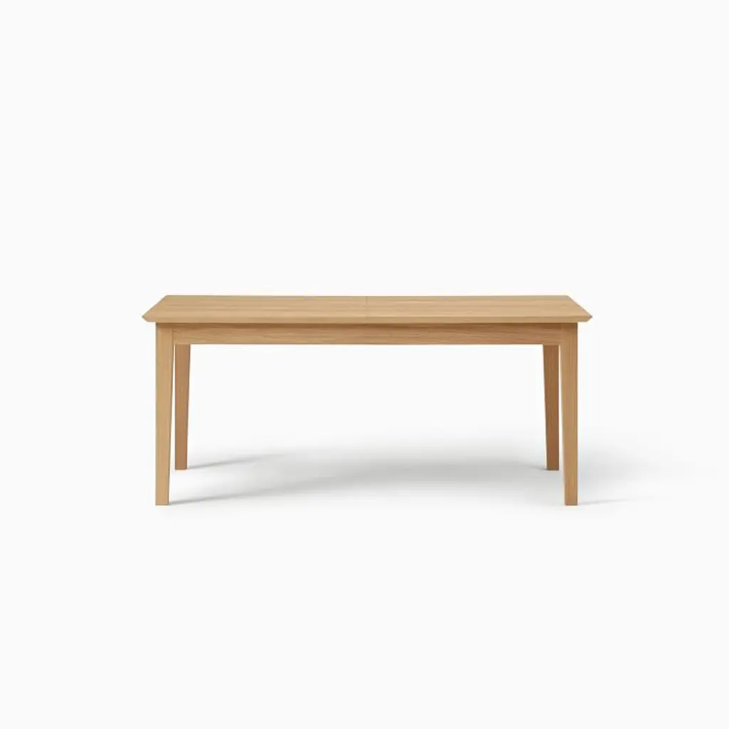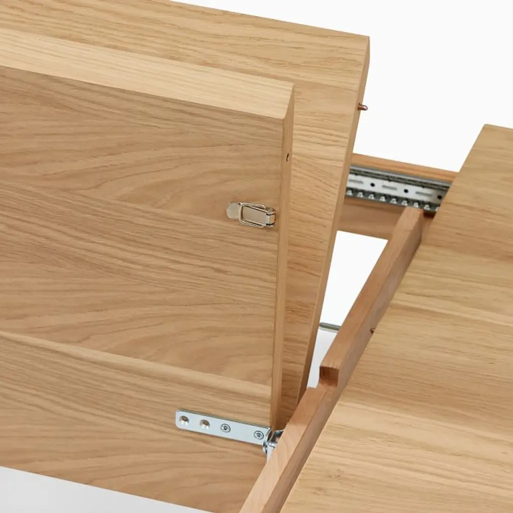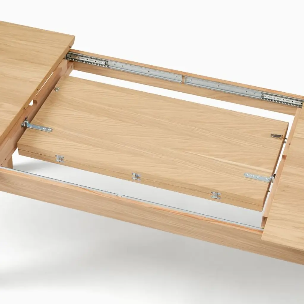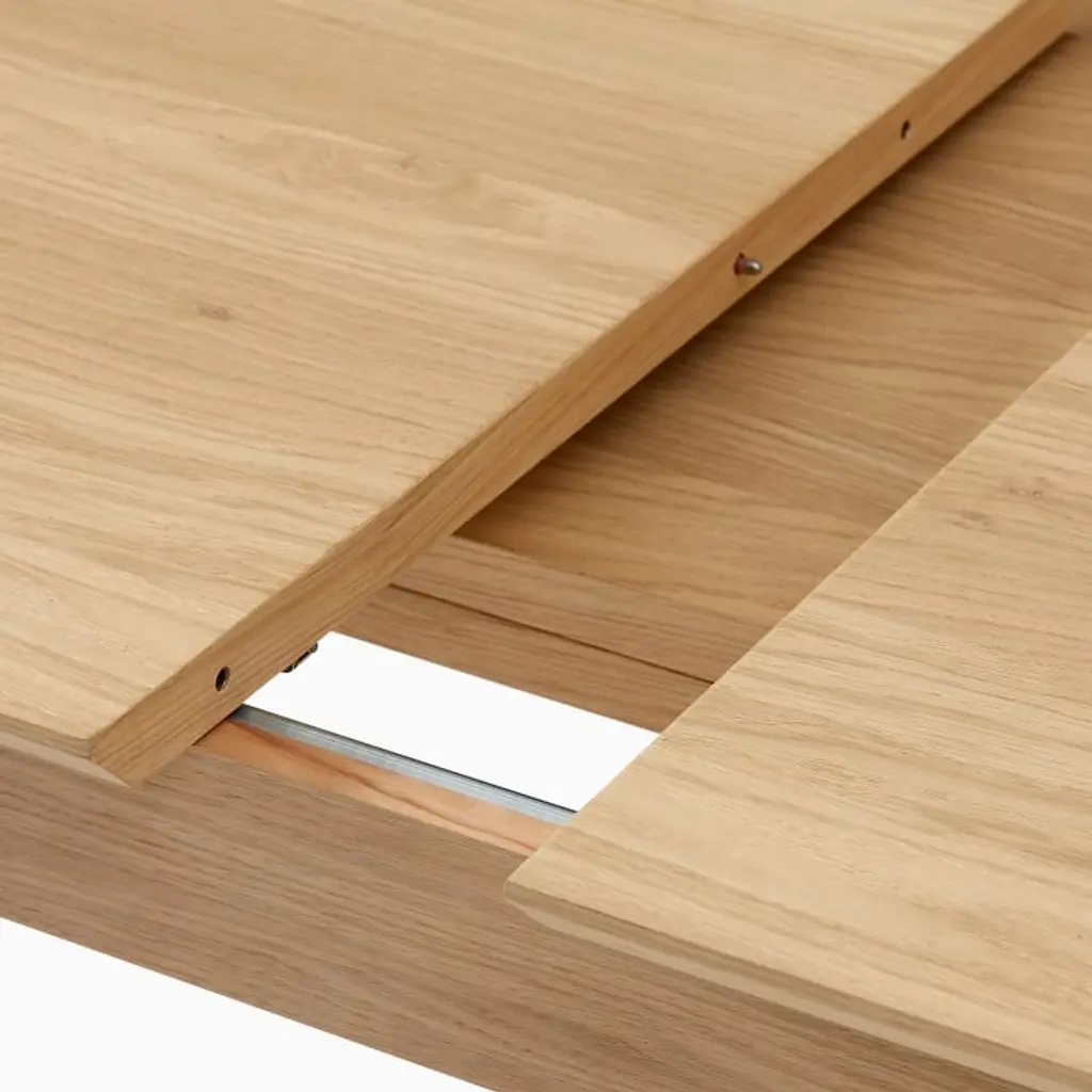 Oak: Solid wood and oak veneer over engineered wood in a Blonde finish. Walnut: Solid wood and walnut veneer over engineered wood in a Walnut finish. Made with FSC®-certified wood from responsibly managed forests. Table expands via a drop-in, self-storing leaf (included). Leaf has variations in finish and grain that may differ from the rest of the table. Legs have built-in levelers to adapt to varying floor levels. Made in Romania.