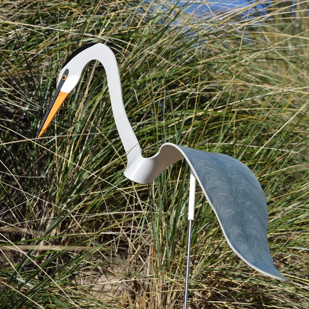 This Great Blue Heron Dancing Bird makes an eye-catching statement in any space thanks to a wonderfully vivid design, beautiful hand-crafted embellishments and mesmerizing movement. Dancing in the wind, this Great Blue Heron moves and sways with the slightest breeze due to a special hinge that allows it to swivel and dip just like the real thing! Made from UV-resistant PVC, it's fade-resistant and entirely hand painted and hand formed. Transform any yard, garden, patio or more into a stage with the movements of this beautifully crafted, unique and dimensional piece of garden art that comes to life in the breeze. It's sturdy and durable sitting atop a 35" galvanized stake. Simply lift the bird off the stake to take in during severe weather or extreme temperatures. Sit back and delight with family and friends or in a quiet moment alone while the breeze sends this feathered friend dancing into motion - truly, a mesmerizing spectacle to enjoy! Made in USA.