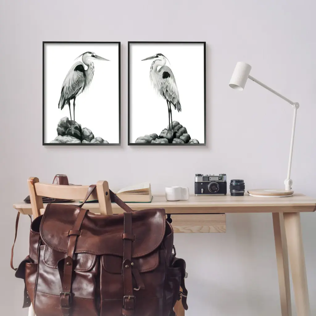 Great Herons Standing Rocks Black White Bird Portraits,16 X 20