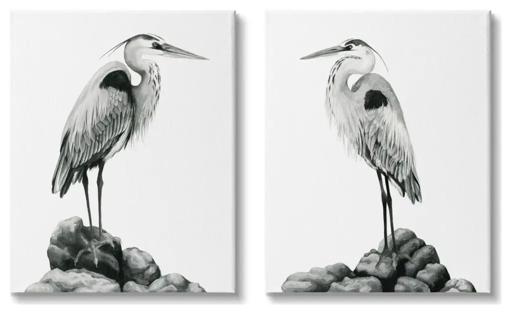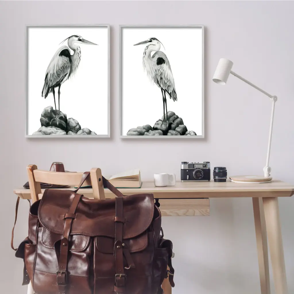 Great Herons Standing Rocks Black White Bird Portraits,24 X 30