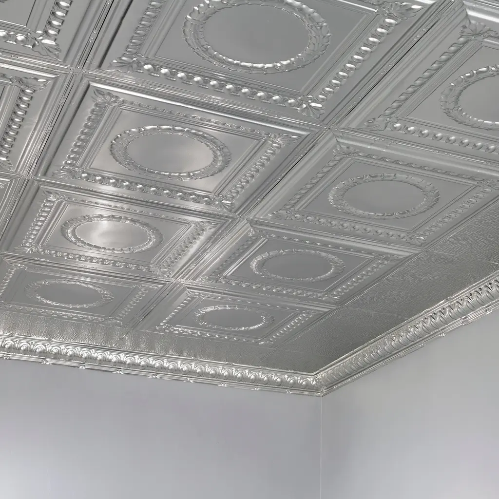 Great Lakes Tin Ceilings provide the classic look of yesteryear with authentic recreations that make a lasting impression in any space. The ceiling tiles are available in both nail-up and lay-in options in numerous styles and finishes. The nail-up tiles are easily applied with nails, screws, or glue. Finish options range from antique or gloss white to bronze burst and copper offerings. Two crown molding styles are also available and provide a finished look to your project. Panels can be cut with tin snips and allow homeowners to achieve a professional look at an affordable price. • Safer than standard tiles; Great Lakes Tin uses only premium-grade 29-gauge tin-plated steel, tested and awarded the Class A 1-Hour Fire Rating • Cut to fit any space; These tiles can be easily cut with tin snips, trimmed to any shape or size to fit your targeted area • Not just for ceilings; Great Lakes Tin tiles can be used to create an antiqued backsplash or rustic accent wall in your home; choose the finish that complements your decor and get to DIY-ing • Easy to install; Lightweight and durable, these tin tiles come in packs of five 2ft x 2ft panels, preventing the trouble and danger of dealing with bulky sheets of metal; simply drop in the tiles to create a beautiful new ceiling in no time; matching crown molding is also available • High quality materials; Tiles are made from genuine tin-plated steel, not plastic or foam board; achieve the rustic authenticity you envision with our one-of-a-kind tin ceiling panels; The Matte White tile has a soft, satin white finish with a matte topcoat