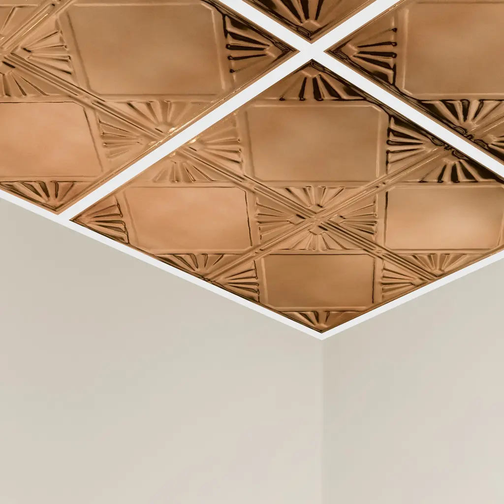Great Lakes Tin Ceilings provide the classic look of yesteryear with authentic recreations that make a lasting impression in any space. The ceiling tiles are available in both nail-up and lay-in options in numerous styles and finishes. The nail-up tiles are easily applied with nails, screws, or glue. Finish options range from antique or gloss white to bronze burst and copper offerings. Two crown molding styles are also available and provide a finished look to your project. Panels can be cut with tin snips and allow homeowners to achieve a professional look at an affordable price. • Safer than standard tiles; Great Lakes Tin uses only premium-grade 29-gauge tin-plated steel, tested and awarded the Class A 1-Hour Fire Rating • Cut to fit any space; These tiles can be easily cut with tin snips, trimmed to any shape or size to fit your targeted area • Not just for ceilings; Great Lakes Tin tiles can be used to create an antiqued backsplash or rustic accent wall in your home; choose the finish that complements your decor and get to DIY-ing • Easy to install; Lightweight and durable, these tin tiles come in packs of five 2ft x 2ft panels, preventing the trouble and danger of dealing with bulky sheets of metal; simply drop in the tiles to create a beautiful new ceiling in no time; matching crown molding is also available • High quality materials; Tiles are made from genuine tin-plated steel, not plastic or foam board; achieve the rustic authenticity you envision with our one-of-a-kind tin ceiling panels; The Matte White tile has a soft, satin white finish with a matte topcoat