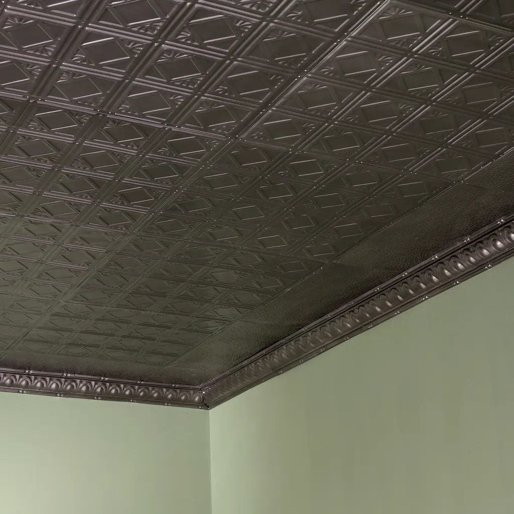 Great Lakes Tin Ceilings provide the classic look of yesteryear with authentic recreations that make a lasting impression in any space. The ceiling tiles are available in both nail-up and lay-in options in numerous styles and finishes. The nail-up tiles are easily applied with nails, screws, or glue. Finish options range from antique or gloss white to bronze burst and copper offerings. Two crown molding styles are also available and provide a finished look to your project. Panels can be cut with tin snips and allow homeowners to achieve a professional look at an affordable price. • Safer than standard tiles; Great Lakes Tin uses only premium-grade 29-gauge tin-plated steel, tested and awarded the Class A 1-Hour Fire Rating • Cut to fit any space; These tiles can be easily cut with tin snips, trimmed to any shape or size to fit your targeted area • Not just for ceilings; Great Lakes Tin tiles can be used to create an antiqued backsplash or rustic accent wall in your home; choose the finish that complements your decor and get to DIY-ing • Easy to install; Lightweight and durable, these tin tiles come in packs of five 2ft x 2ft panels, preventing the trouble and danger of dealing with bulky sheets of metal; simply drop in the tiles to create a beautiful new ceiling in no time; matching crown molding is also available • High quality materials; Tiles are made from genuine tin-plated steel, not plastic or foam board; achieve the rustic authenticity you envision with our one-of-a-kind tin ceiling panels; The Matte White tile has a soft, satin white finish with a matte topcoat