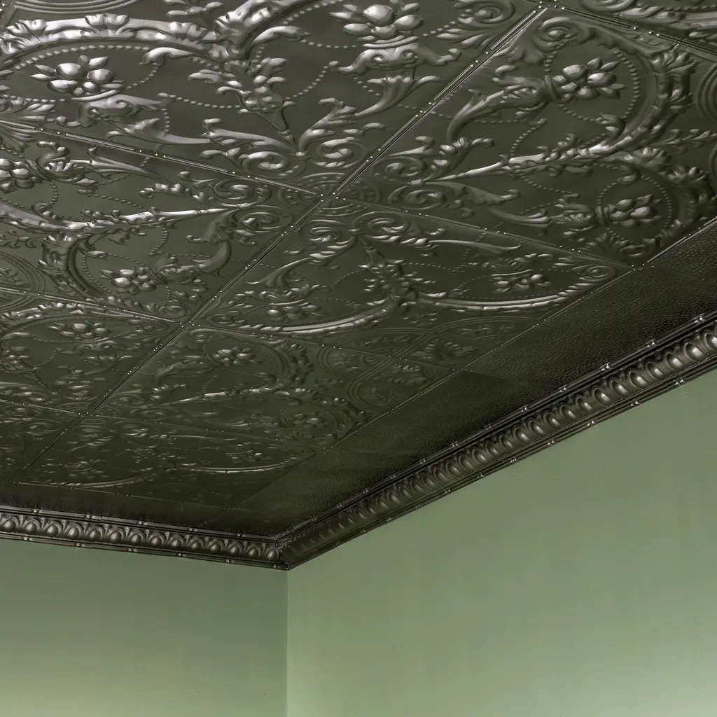 Great Lakes Tin Ceilings provide the classic look of yesteryear with authentic recreations that make a lasting impression in any space. The ceiling tiles are available in both nail-up and lay-in options in numerous styles and finishes. The nail-up tiles are easily applied with nails, screws, or glue. Finish options range from antique or gloss white to bronze burst and copper offerings. Two crown molding styles are also available and provide a finished look to your project. Panels can be cut with tin snips and allow homeowners to achieve a professional look at an affordable price. • Safer than standard tiles; Great Lakes Tin uses only premium-grade 29-gauge tin-plated steel, tested and awarded the Class A 1-Hour Fire Rating • Cut to fit any space; These tiles can be easily cut with tin snips, trimmed to any shape or size to fit your targeted area • Not just for ceilings; Great Lakes Tin tiles can be used to create an antiqued backsplash or rustic accent wall in your home; choose the finish that complements your decor and get to DIY-ing • Easy to install; Lightweight and durable, these tin tiles come in packs of five 2ft x 2ft panels, preventing the trouble and danger of dealing with bulky sheets of metal; simply drop in the tiles to create a beautiful new ceiling in no time; matching crown molding is also available • High quality materials; Tiles are made from genuine tin-plated steel, not plastic or foam board; achieve the rustic authenticity you envision with our one-of-a-kind tin ceiling panels; The Matte White tile has a soft, satin white finish with a matte topcoat