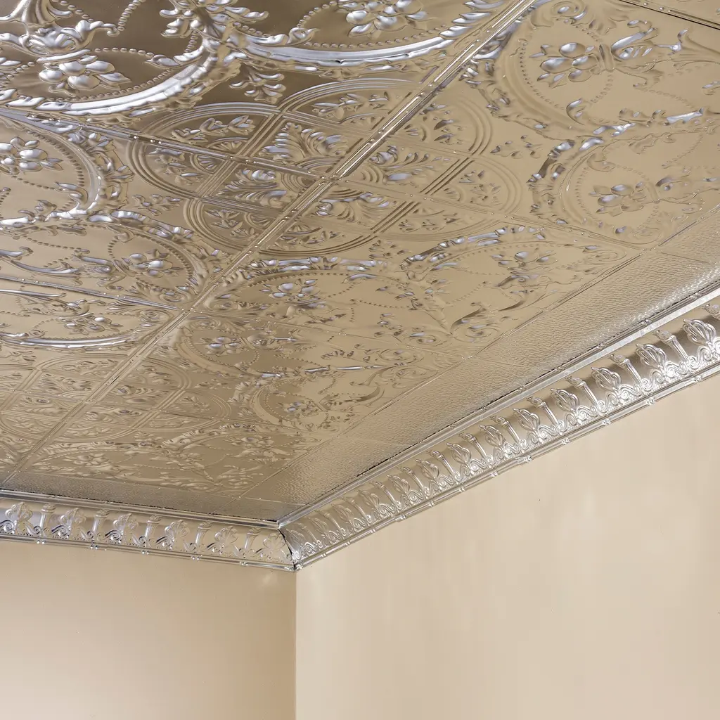 Great Lakes Tin Ceilings provide the classic look of yesteryear with authentic recreations that make a lasting impression in any space. The ceiling tiles are available in both nail-up and lay-in options in numerous styles and finishes. The nail-up tiles are easily applied with nails, screws, or glue. Finish options range from antique or gloss white to bronze burst and copper offerings. Two crown molding styles are also available and provide a finished look to your project. Panels can be cut with tin snips and allow homeowners to achieve a professional look at an affordable price. • Safer than standard tiles; Great Lakes Tin uses only premium-grade 29-gauge tin-plated steel, tested and awarded the Class A 1-Hour Fire Rating • Cut to fit any space; These tiles can be easily cut with tin snips, trimmed to any shape or size to fit your targeted area • Not just for ceilings; Great Lakes Tin tiles can be used to create an antiqued backsplash or rustic accent wall in your home; choose the finish that complements your decor and get to DIY-ing • Easy to install; Lightweight and durable, these tin tiles come in packs of five 2ft x 2ft panels, preventing the trouble and danger of dealing with bulky sheets of metal; simply drop in the tiles to create a beautiful new ceiling in no time; matching crown molding is also available • High quality materials; Tiles are made from genuine tin-plated steel, not plastic or foam board; achieve the rustic authenticity you envision with our one-of-a-kind tin ceiling panels; The Matte White tile has a soft, satin white finish with a matte topcoat