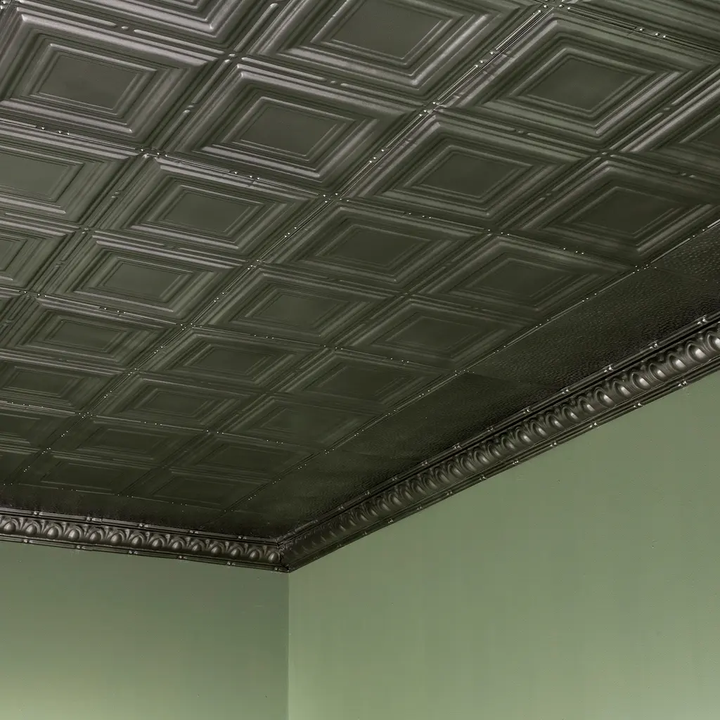 Great Lakes Tin Ceilings provide the classic look of yesteryear with authentic recreations that make a lasting impression in any space. The ceiling tiles are available in both nail-up and lay-in options in numerous styles and finishes. The nail-up tiles are easily applied with nails, screws, or glue. Finish options range from antique or gloss white to bronze burst and copper offerings. Two crown molding styles are also available and provide a finished look to your project. Panels can be cut with tin snips and allow homeowners to achieve a professional look at an affordable price. • Safer than standard tiles; Great Lakes Tin uses only premium-grade 29-gauge tin-plated steel, tested and awarded the Class A 1-Hour Fire Rating • Cut to fit any space; These tiles can be easily cut with tin snips, trimmed to any shape or size to fit your targeted area • Not just for ceilings; Great Lakes Tin tiles can be used to create an antiqued backsplash or rustic accent wall in your home; choose the finish that complements your decor and get to DIY-ing • Easy to install; Lightweight and durable, these tin tiles come in packs of five 2ft x 2ft panels, preventing the trouble and danger of dealing with bulky sheets of metal; simply nail up the tiles to create a beautiful new ceiling in no time; matching crown molding is also available • High quality materials; Tiles are made from genuine tin-plated steel, not plastic or foam board; achieve the rustic authenticity you envision with our one-of-a-kind tin ceiling panels; The Matte White tile has a soft, satin white finish with a matte topcoat • A sample is a 12in x 12in portion of a full tile with no overlapping features and not intended for installation.