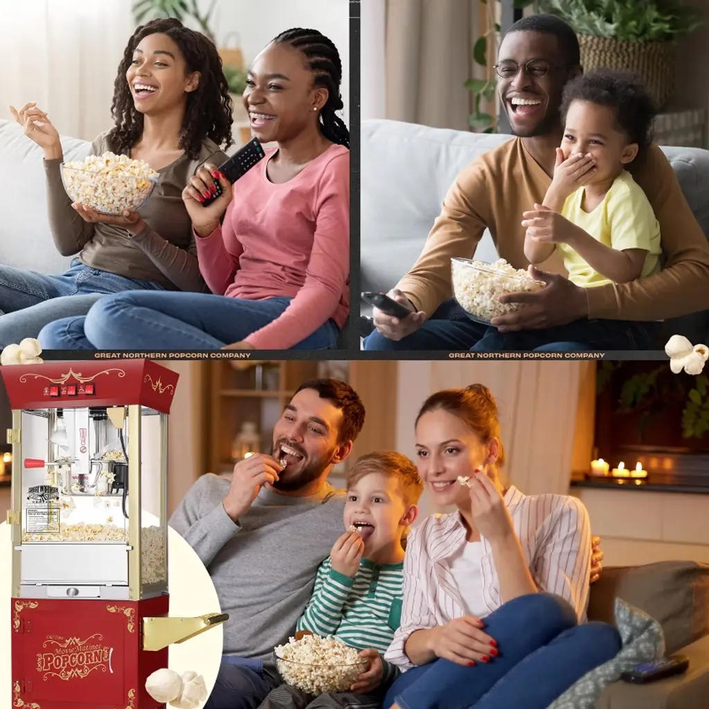 Bring the flavor and the fun of the movie theater experience to your own home with the Matinee Popcorn Machine 8 oz Popper with Cart by Great Northern Popcorn. This large but portable pop corn machine comes with a detachable two-wheeled cart and features a party-ready output, producing up to 3 gallons (48 cups) per batch in minutes — but don’t worry, it can whip up smaller batches for a cozy movie night, too. The Matinee popcorn machine maker is the perfect popper for any family, and perfectly giftable, too, featuring a quality stainless-steel kettle with a built-in stirrer, tempered glass food zones for safety, and a nostalgic appearance that will look great whether you use it at parties or display the popcorn machine stand in your family room to accent other home theater accessories.