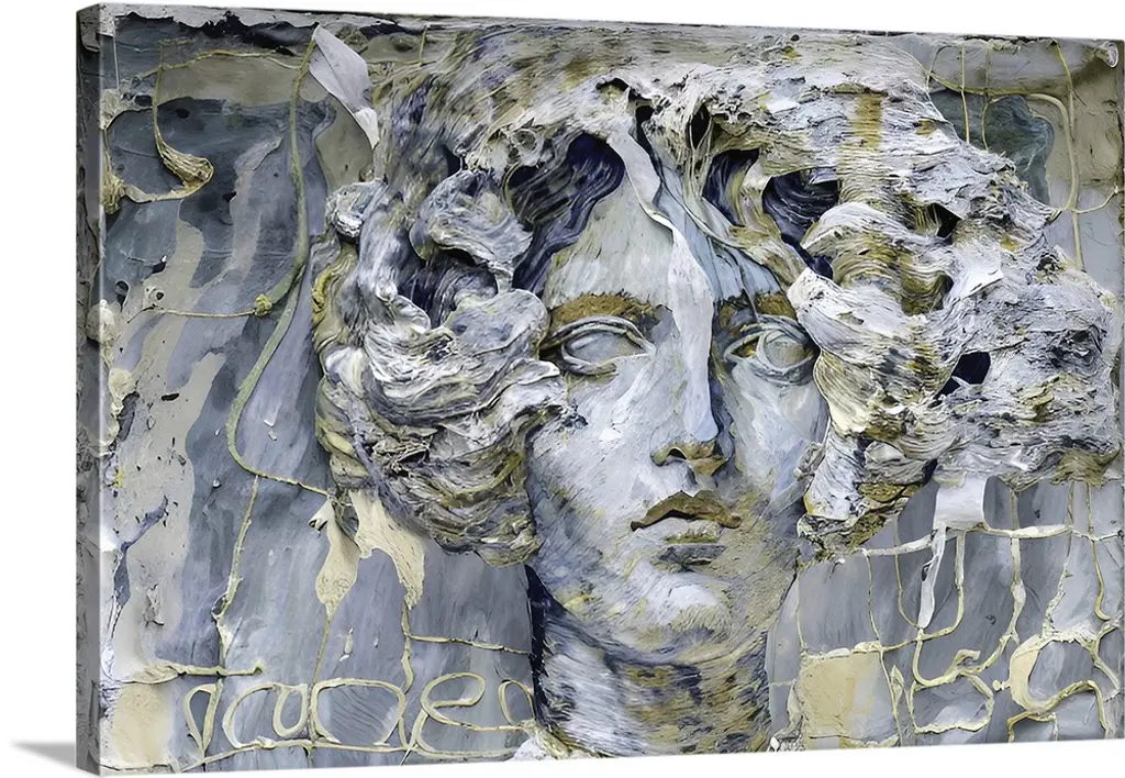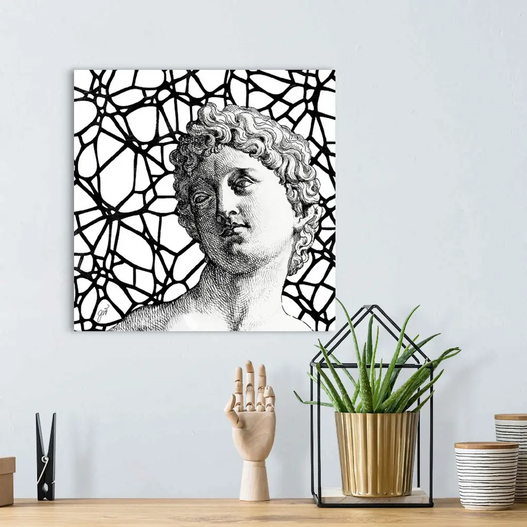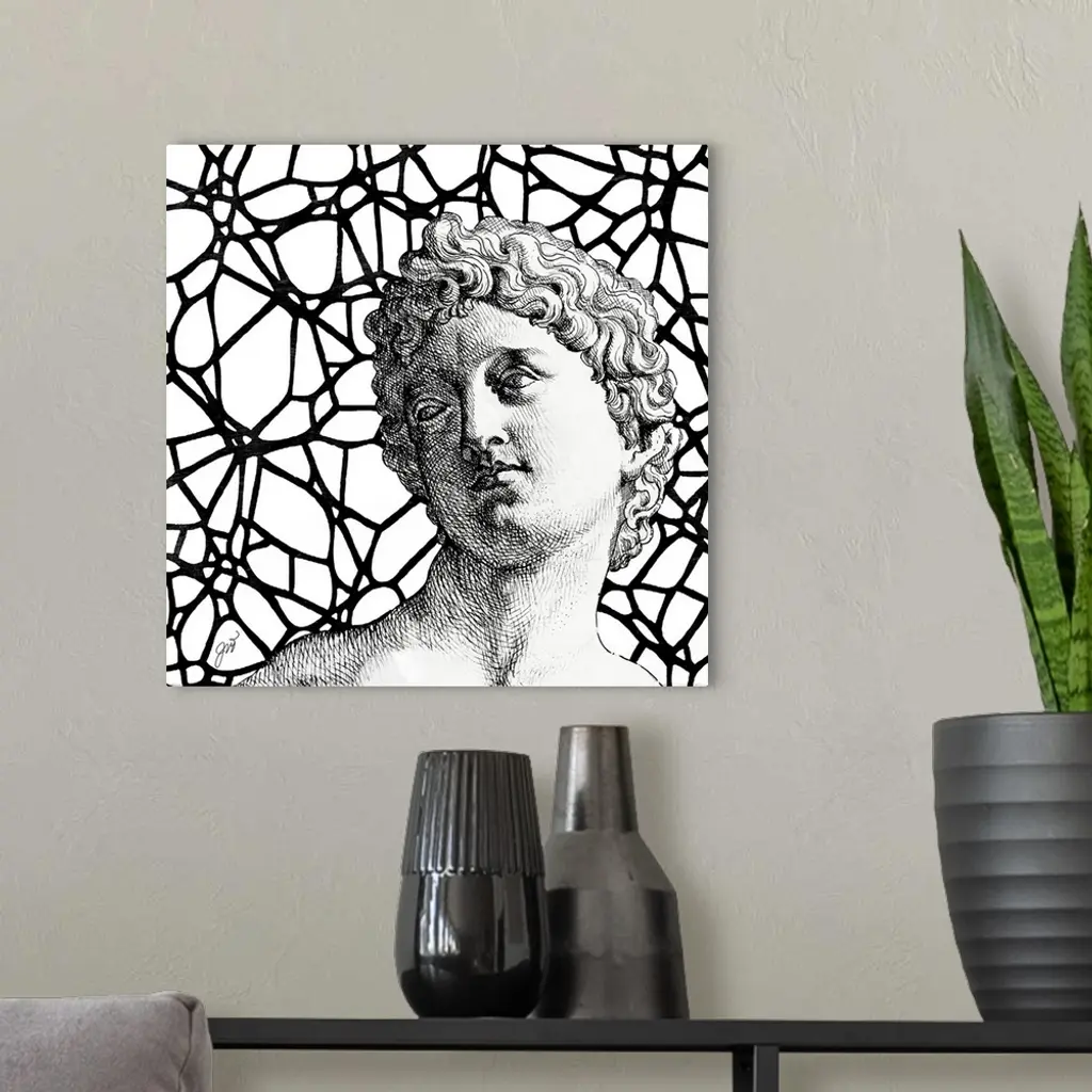A classical Greco-Roman bust of a man over a modern graphic background.