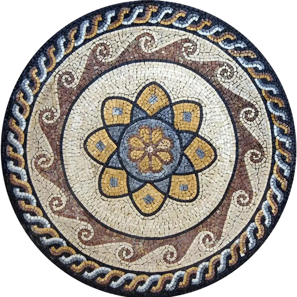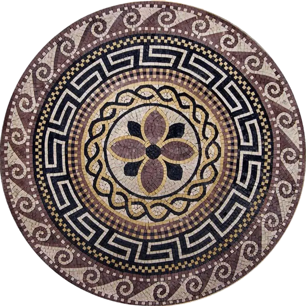 Create a grand entrance with the Athena Greco-Roman medallion. This beautiful natural stone mosaic showcases an elegant flower center and uses plenty of black tile. A Greek key and outer wave pattern finish the design. Order in a custom size for your decorative tiles project or select from our 4 standard sizes. Your mosaic medallion comes on a mesh backing for quick mounting and installation.