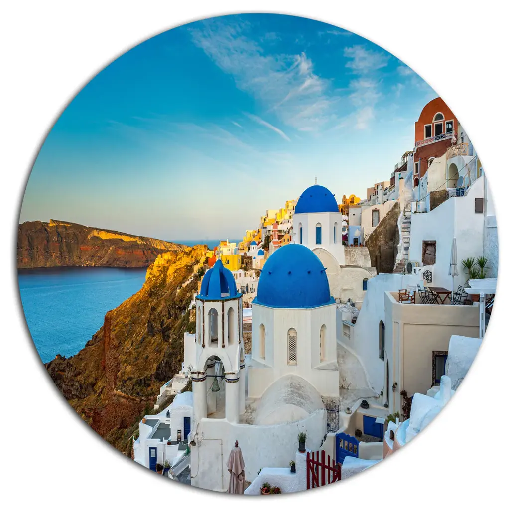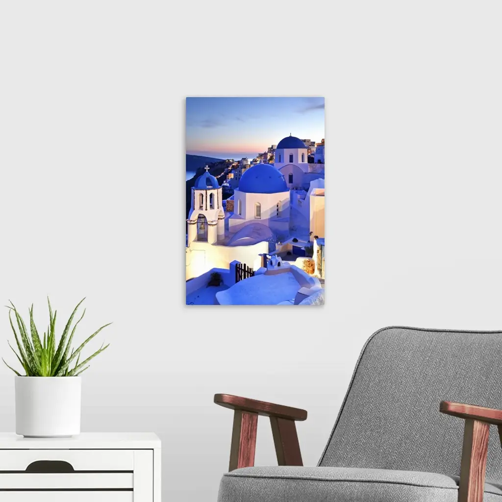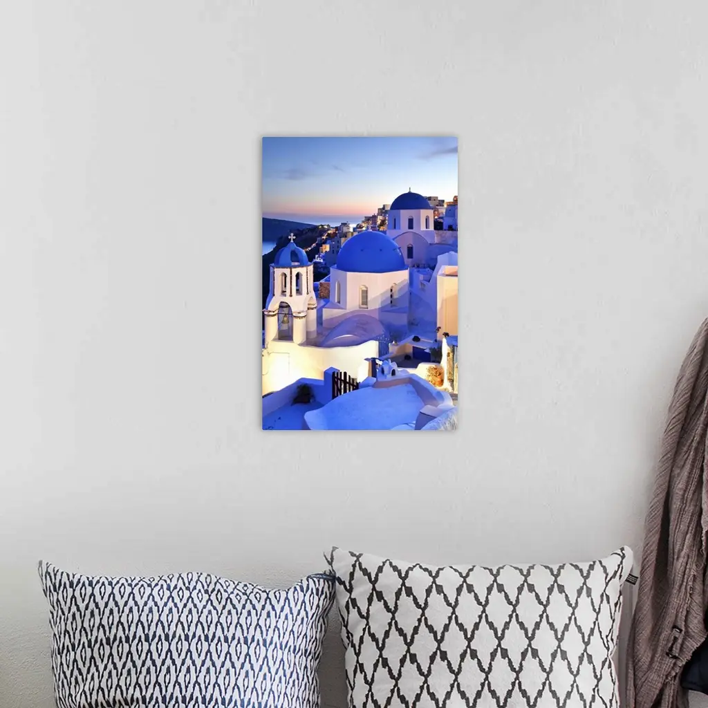 Greece, Aegean islands, Cyclades, Santorini island, Greek Islands, Typical church in Oia village at dusk.