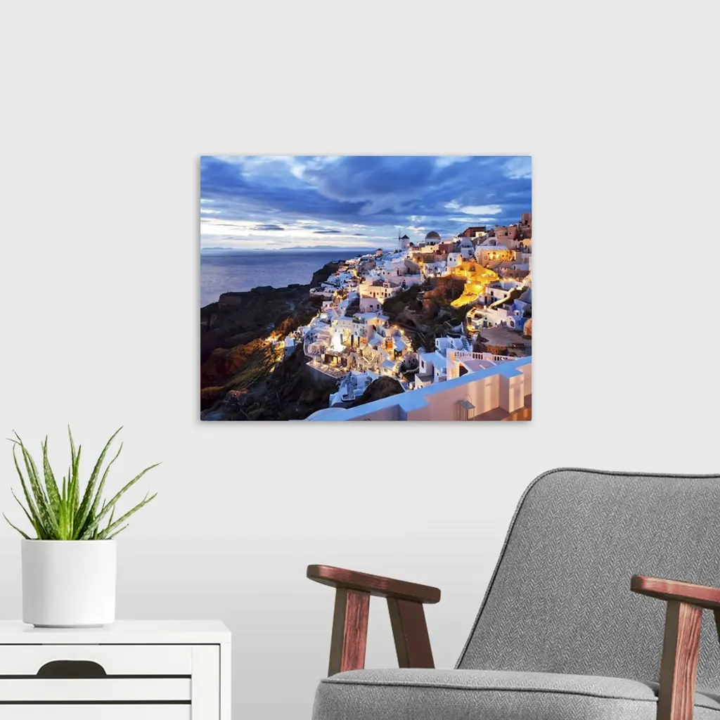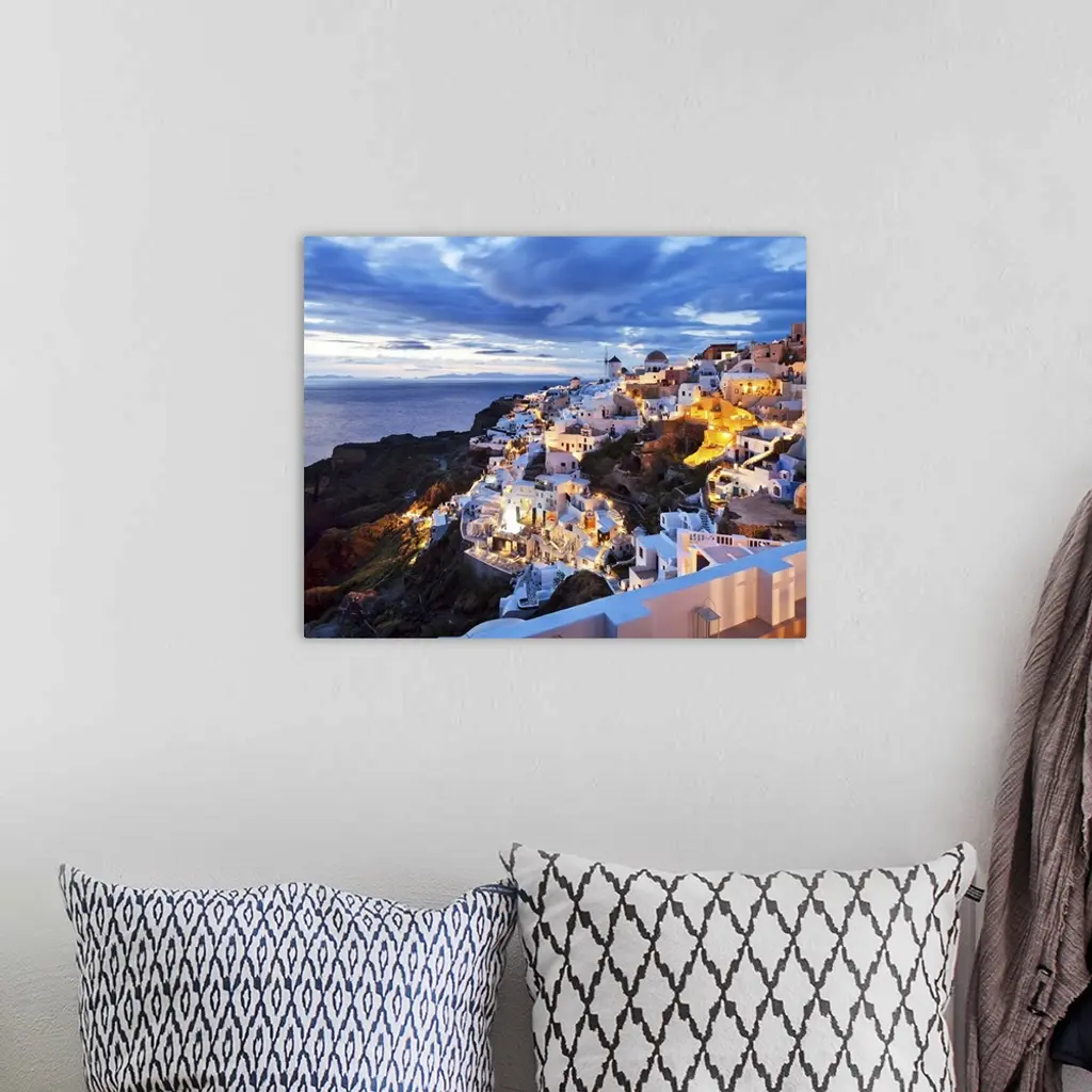 Greece, Aegean islands, Cyclades, Santorini island, Greek Islands, Oia village illuminated at dusk.