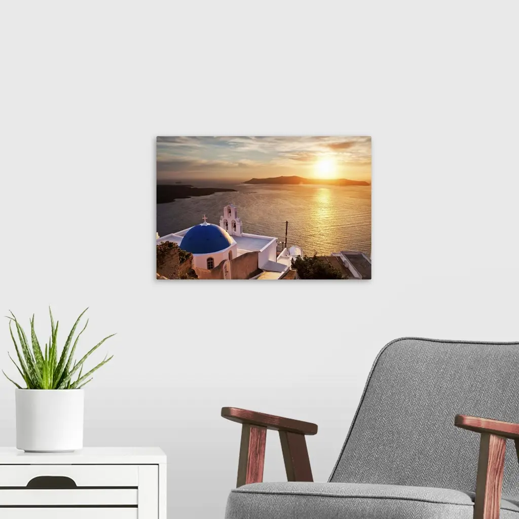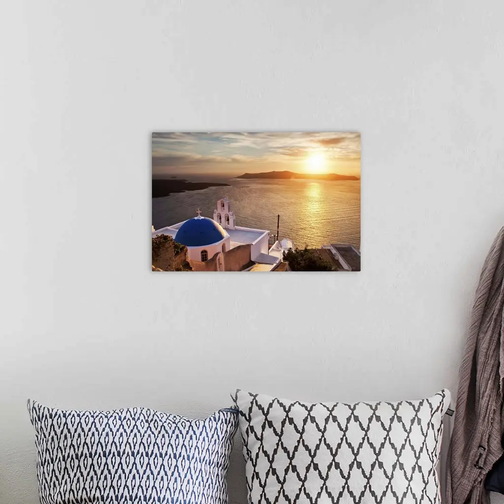 Greece, Santorini Island, Church Overlooking The Sea And The Caldera At Sunset, Fira