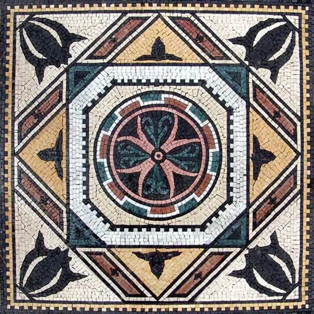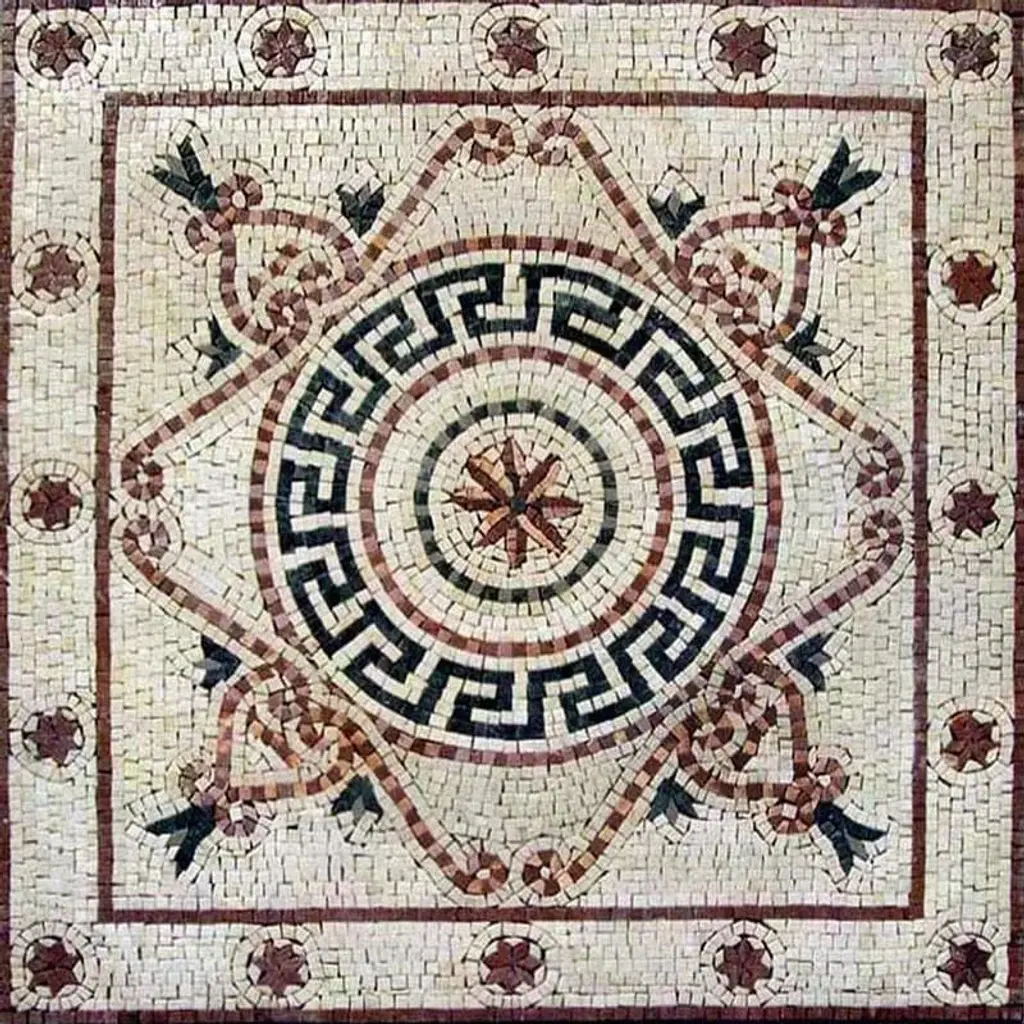 Transform your space with the exquisite Greek Floor Mosaic - Hepta, a stunning decorative tile that blends elegance and artistry. This unique mosaic features a captivating floral design intertwined with the timeless Greek key motif, creating a visual masterpiece that will elevate the aesthetic of any home or office. The intricate border adorned with 7-point stars adds an extra layer of sophistication, making this mosaic floor panel not just a flooring option, but a statement piece.The Greek Floor Mosaic - Hepta is available in both standard and custom sizes, ensuring that you can find the perfect fit for your specific project or design vision. Whether you’re looking to enhance a living room, kitchen, hallway, or any other space, this versatile mosaic tile offers endless possibilities for creativity and personalization.Crafted with attention to detail and quality, the Greek Floor Mosaic - Hepta is not only visually striking but also durable, making it suitable for both residential and commercial use. The vibrant colors and intricate patterns are designed to withstand the test of time, ensuring that your flooring remains beautiful for years to come.Incorporate the Greek Floor Mosaic - Hepta into your renovations or new builds to bring a touch of classical elegance and charm. The seamless blend of contemporary style with traditional Greek artistry makes it a perfect choice for those wanting to make a bold design statement. Experience the beauty and sophistication of Greek-inspired decor and transform your environment today with the Greek Floor Mosaic - Hepta.