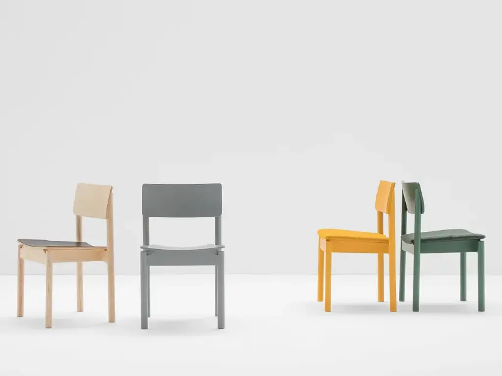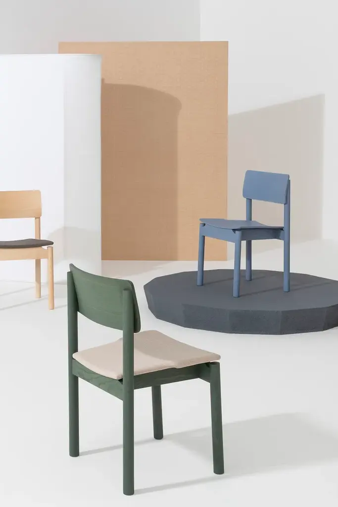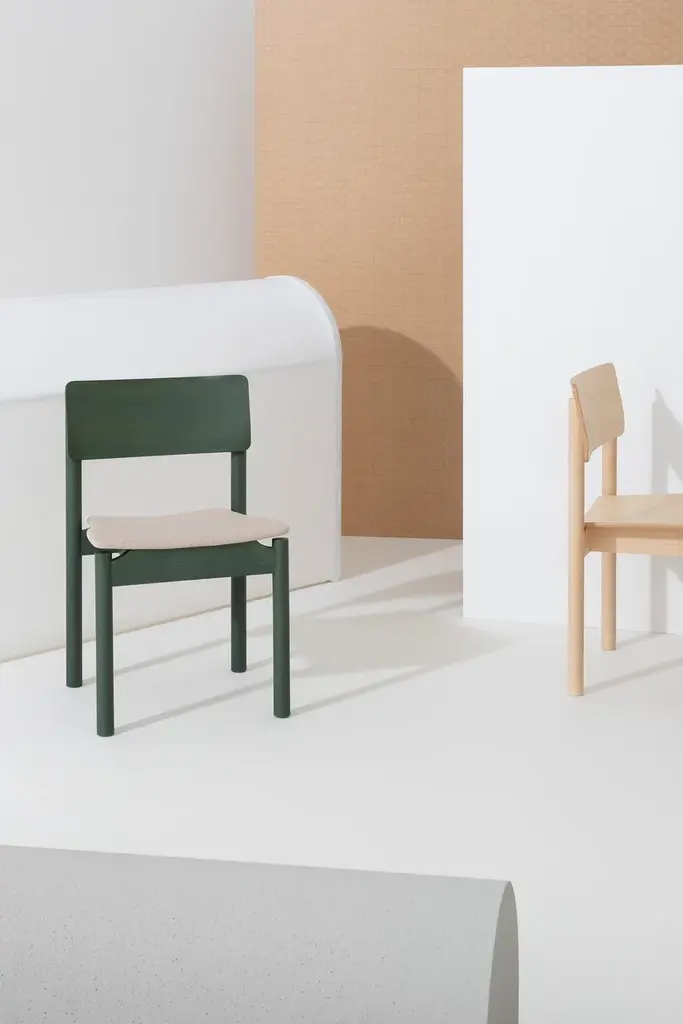 Green 002 is a stackable chair with an ash wood frame and an upholstered seat.Green is a collection that includes a wooden chair inspired by Nordic design from the 1930s.The profile, solid yet essential, integrates the structural elements, while the curved backrest is welcoming, as is the shaping of the seat.The legs, oversized compared to the usual, are lightened by the thin, elevated seat.