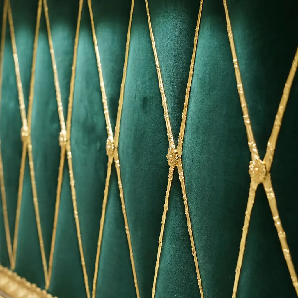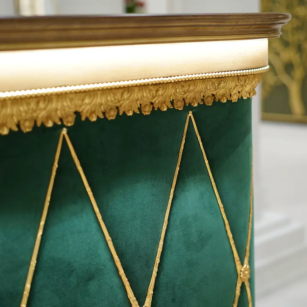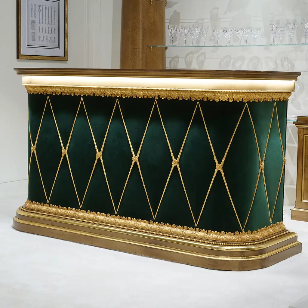 A distinctive design to showcase in an opulent living room or entryway decor, this gorgeous console or bar tabletop will take center stage in an interior setting of both private and hospitality nature. Handcrafted of lime wood, it is upholstered with precious green velvet and decorated with 24k gold-plated bronze details.