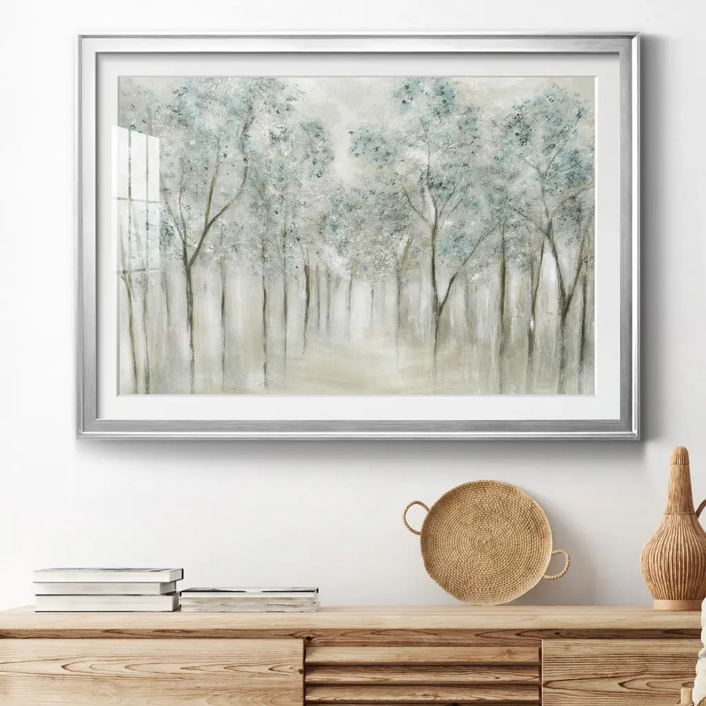 This lovely tree line image comes matted and under glass. It is finished with a deep brown wood tone moulding that compliments the overall look.