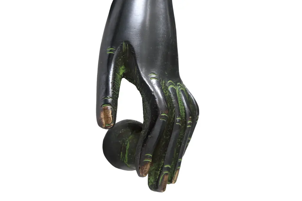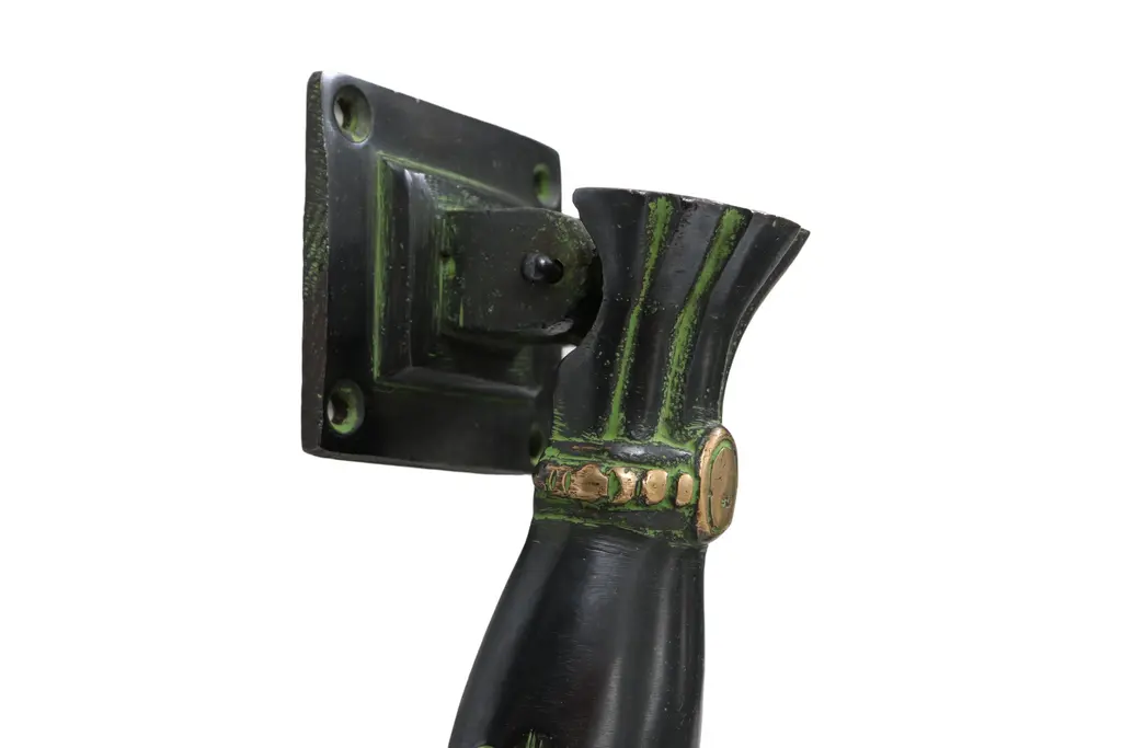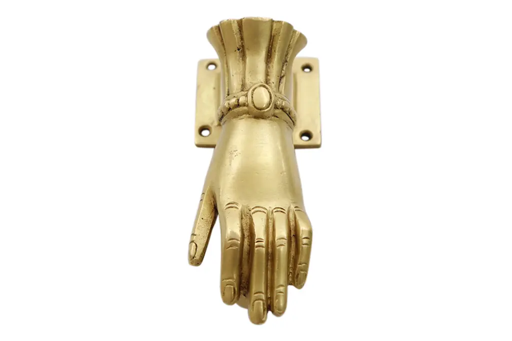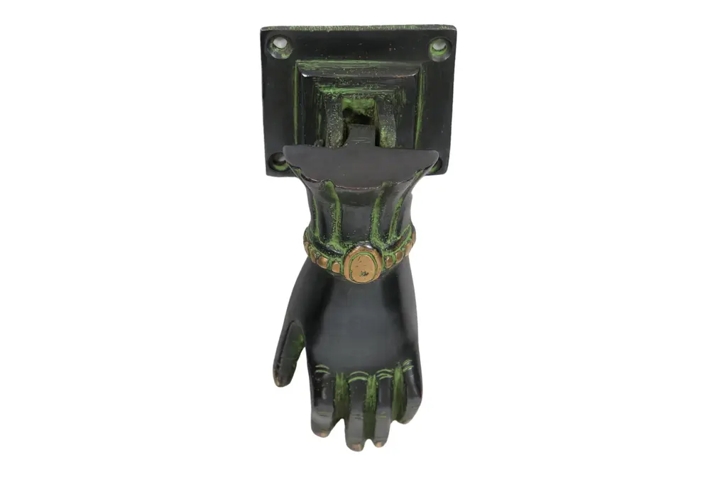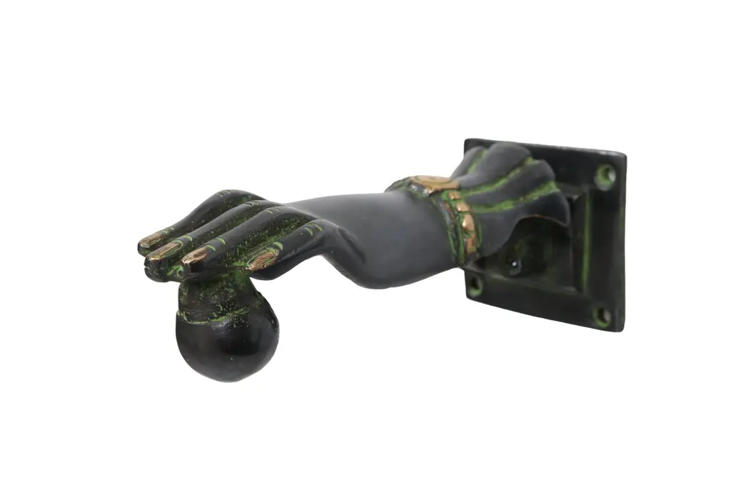 A green brass door knocker shaped like a hand holding a ball. Cast with a prominent cuff decorated with a cabochon topped bracelet. Line details define the knuckles and finger tips. A rectangular brass back plate hinges behind the cuff.