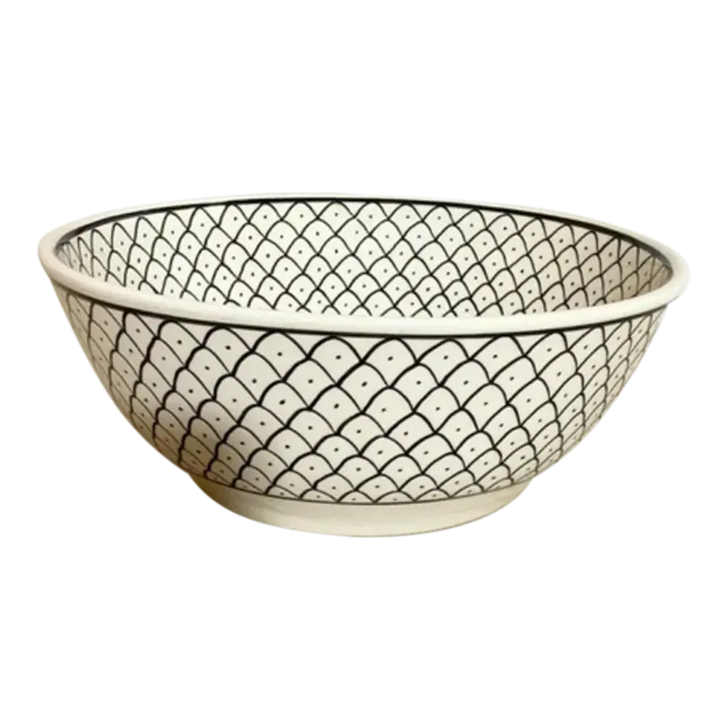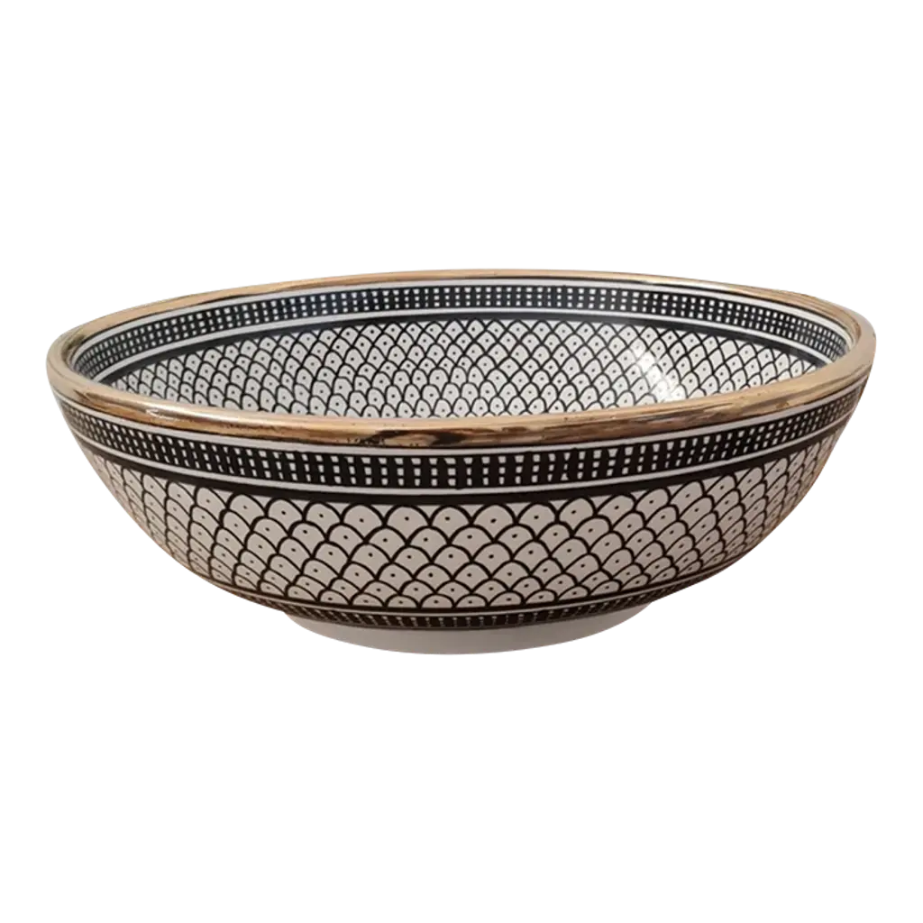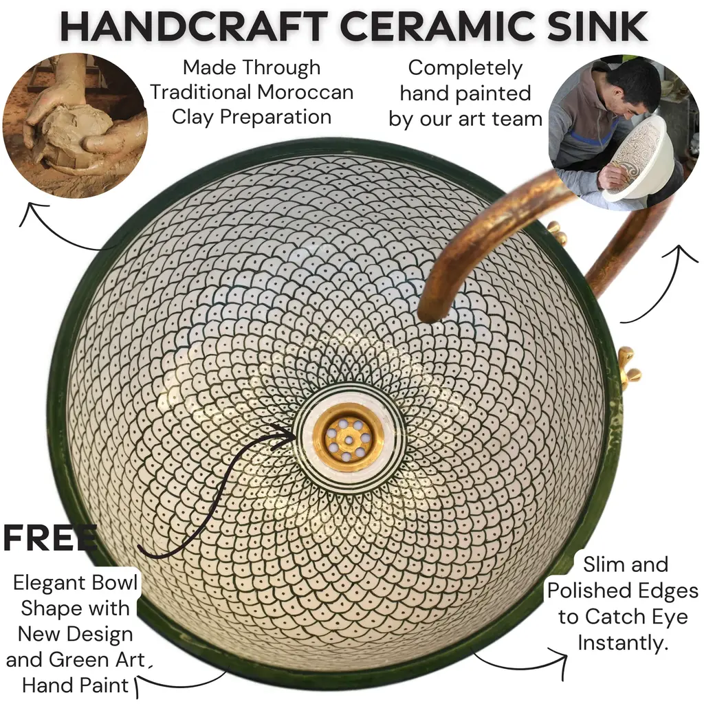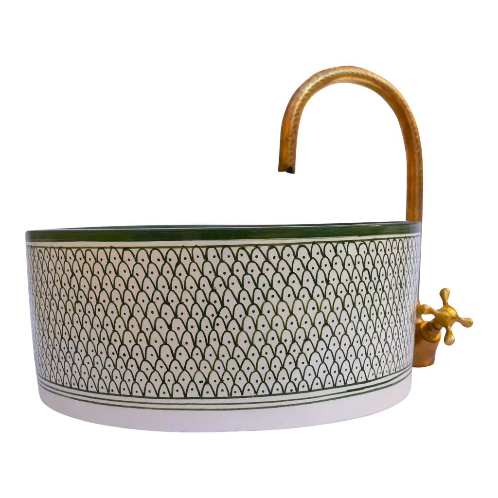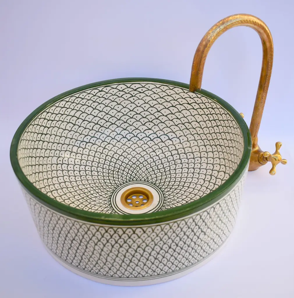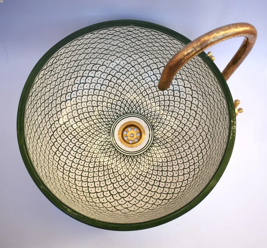 Elevate your bathroom with our exquisite Green Ceramic Vessel Sink, a true masterpiece of craftsmanship that combines mid-century charm with contemporary style. Crafted from high-quality ceramic, this sink features a stunning Green Fish Scale pattern, meticulously hand-painted by our skilled Moroccan artisans. ensuring it complements your bathroom's aesthetic perfectly. Whether you're designing a modern sanctuary or a rustic retreat, our Green Ceramic Vessel Sink effortlessly adapts to your vision. This Countertop Large Sink adds a touch of sophistication to any bathroom, with its elegant design and captivating Fish Scale motif. Its durable pottery construction ensures long-lasting quality, making it a practical and beautiful addition to your lavatory. Plus, each sink comes with a complimentary brass drain, simplifying your installation process. As you indulge in this one-of-a-kind piece, revel in the knowledge that your bathroom is graced by a work of art, painstakingly crafted just for you. Elevate your bathroom with our exquisite Green Ceramic Vessel Sink, a true masterpiece of craftsmanship that combines mid-century charm with contemporary style. Crafted from high-quality ceramic, this sink features a stunning Green Fish Scale pattern, meticulously hand-painted by our skilled Moroccan artisans. this sink can be tailored to any color of your choice, ensuring it complements your bathroom's aesthetic perfectly. Whether you're designing a modern sanctuary or a rustic retreat, our Green Ceramic Vessel Sink effortlessly adapts to your vision. This Green Countertop Large Sink adds a touch of sophistication to any bathroom, with its elegant design and captivating Fish Scale motif. Its durable pottery construction ensures long-lasting quality, making it a practical and beautiful addition to your lavatory. Plus, each sink comes with a complimentary brass drain, simplifying your installation process. Please note that due to the handcrafted nature of this sink, there may be slight variations in color and pattern, making each piece truly unique.