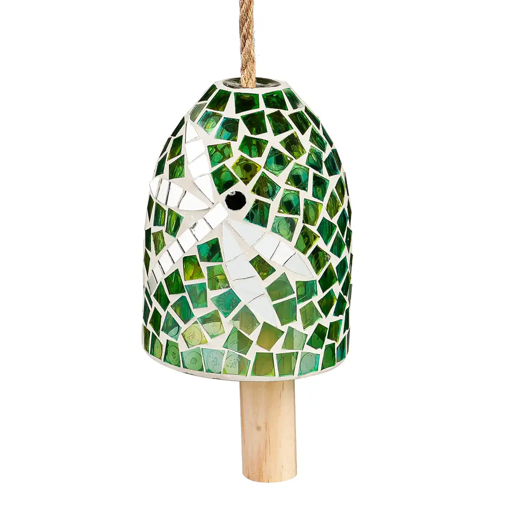 The shimmering shards of glass on this Green Dragonfly Mosaic Bell Chime catch the sunlight beautifully and bring a cheerful chime to any outdoor space. With a wooden clapper and striking mosaic design, this garden bell will bring a joyful sound and sight! Durable construction with high-quality materials ensure this chime will withstand the elements for continued outdoor use. Perfect for a garden, yard, on a shepherd's hook, on a patio and more. Hang this bell chime from the rope loop for easy hanging and effortless presentation. Jute hanging rope and wooden clapper. Also makes a great gift!