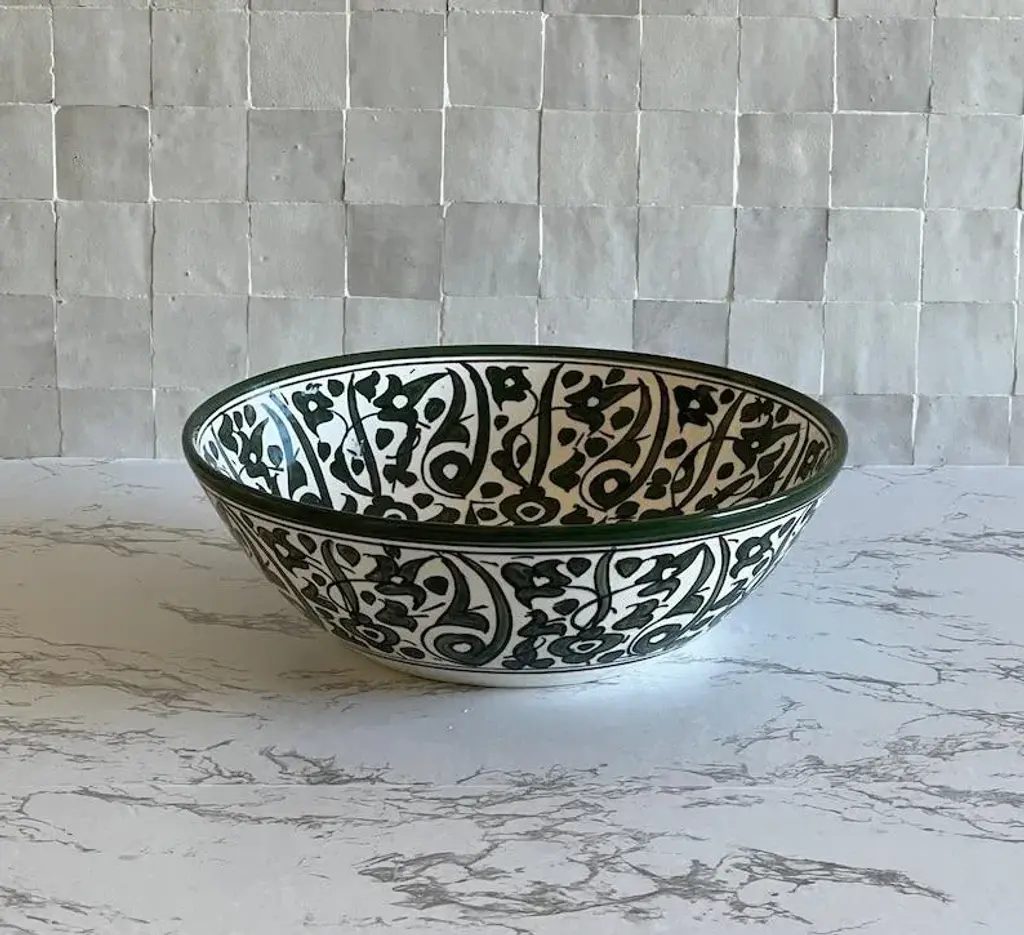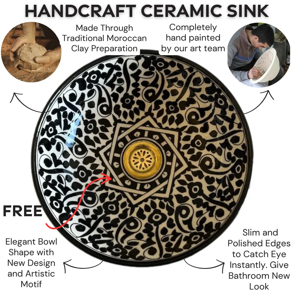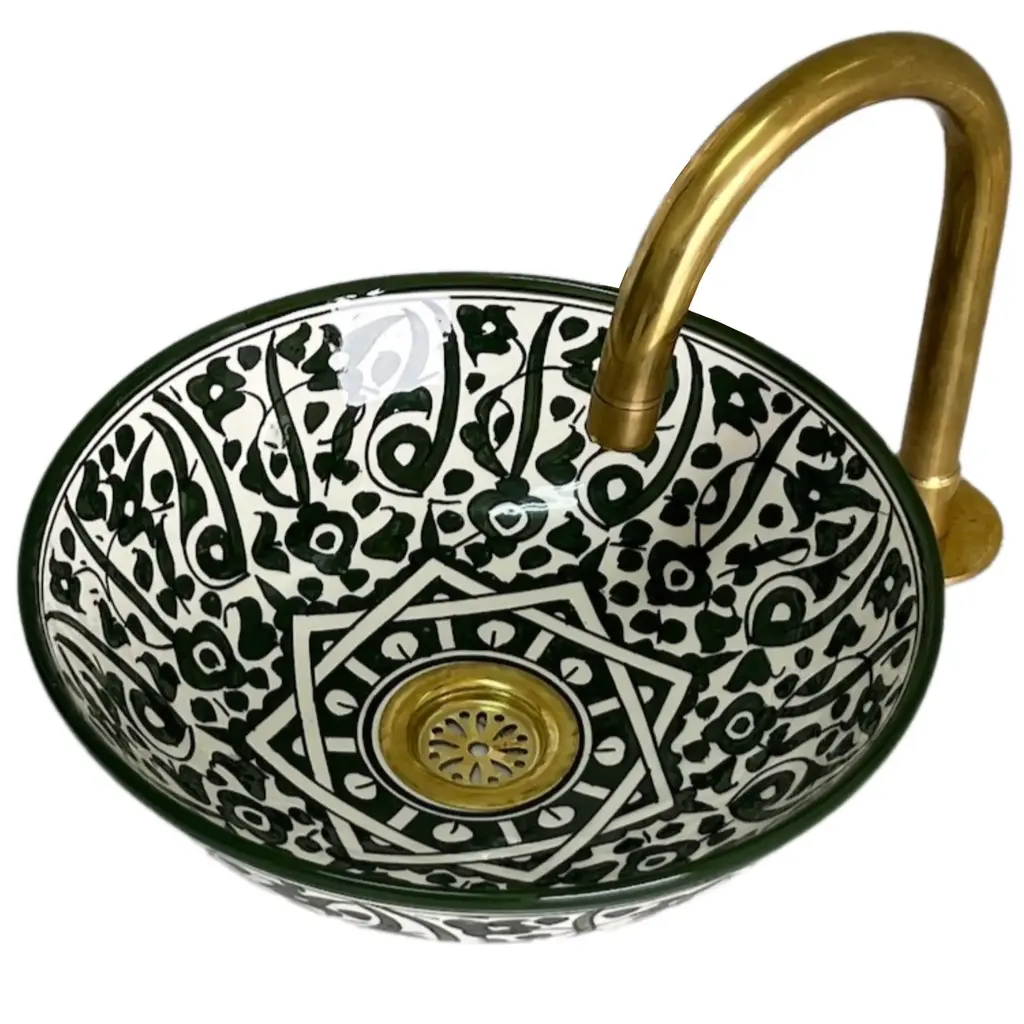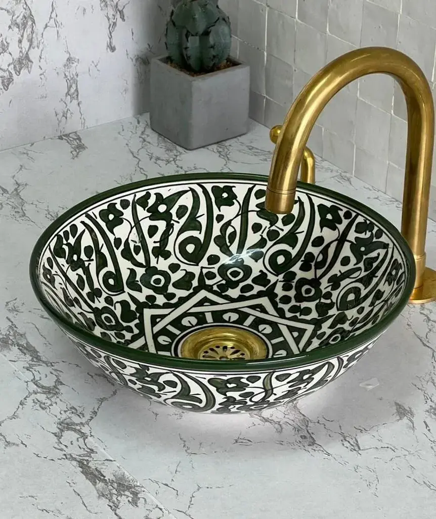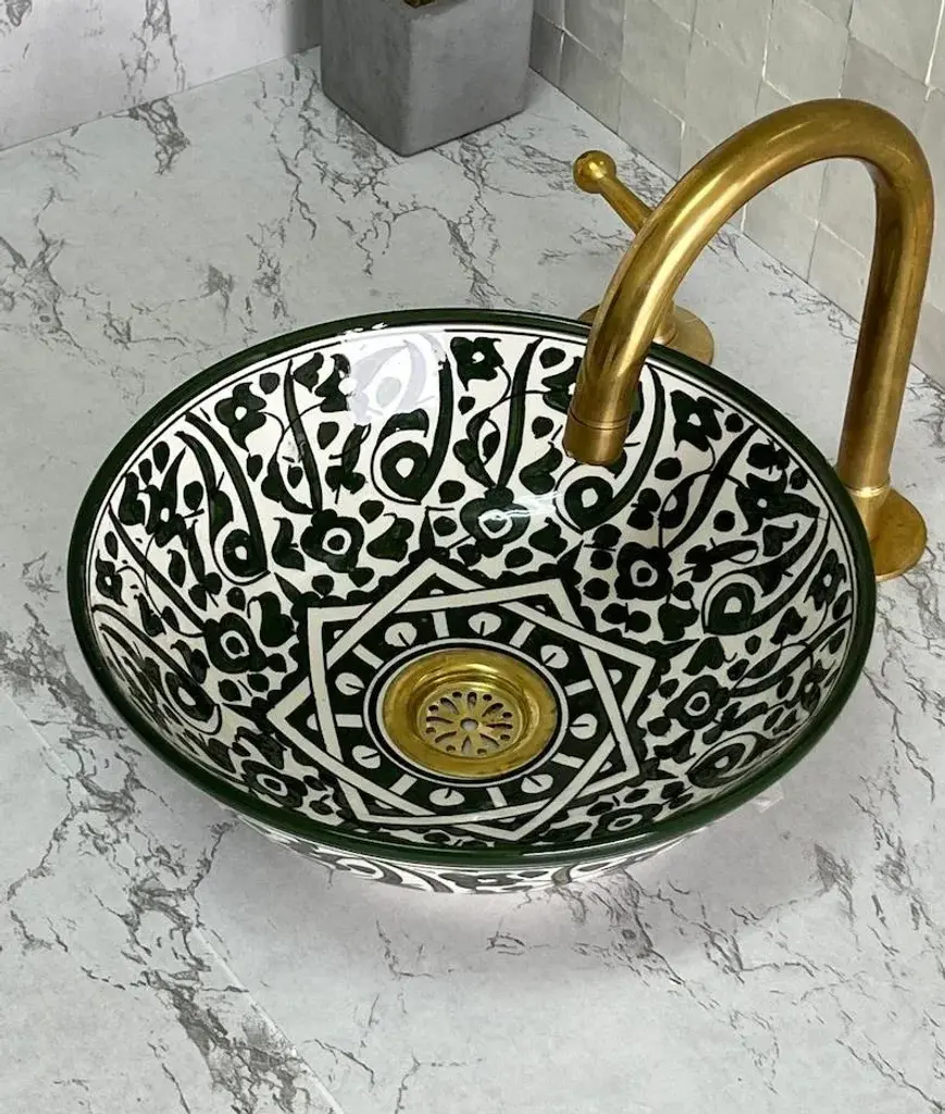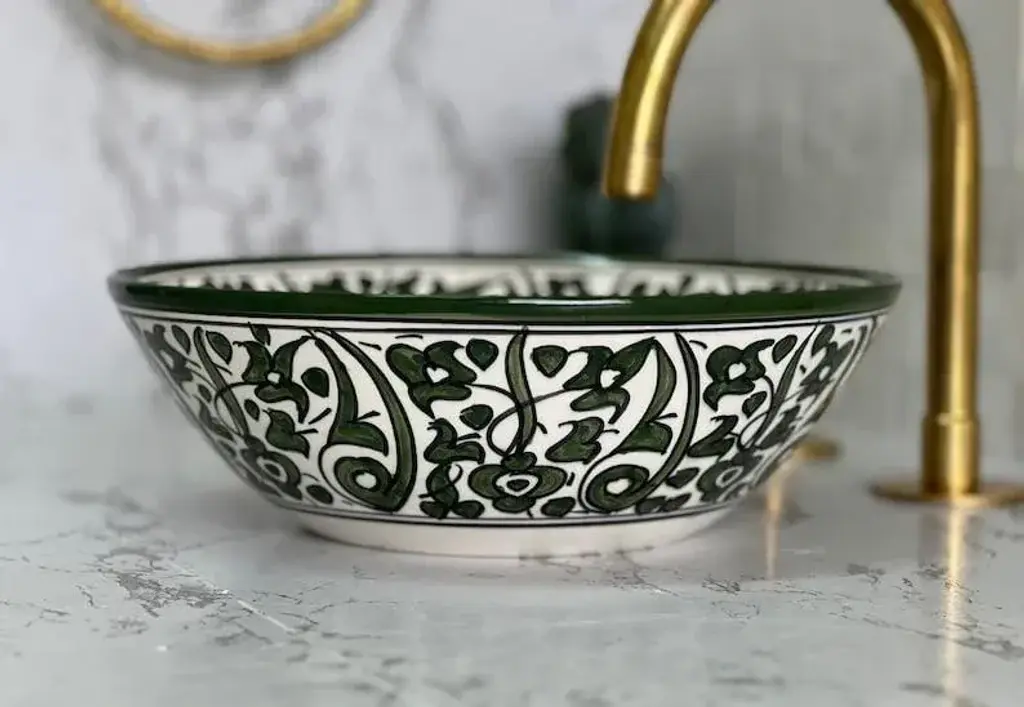 1) Experience the unparalleled beauty of our Flower Ceramic Sink Bowl, expertly crafted by skilled Moroccan artisans. This stunning drop-in vessel sink is meticulously made from top-quality ceramic, guaranteeing long-lasting durability and enduring sophistication. Adorned with a mesmerizing Green Flowers design, complete with a striking star pattern at its heart, this exquisite piece seamlessly combines elements of nature with the enchanting allure of Moroccan artistry. 2) Our Antique Ceramic Sink Bowls are true works of art, meticulously hand-painted by our talented craftsmen. The attention to detail and commitment to quality shine through in each and every piece. The vibrant shades of Green breathe life into any room, making it an excellent choice for those in search of a small, yet eye-catching, bathroom or lavatory sink