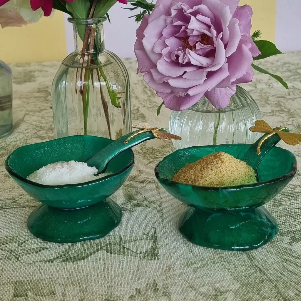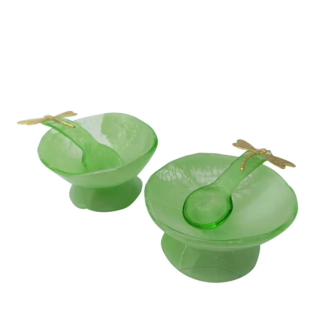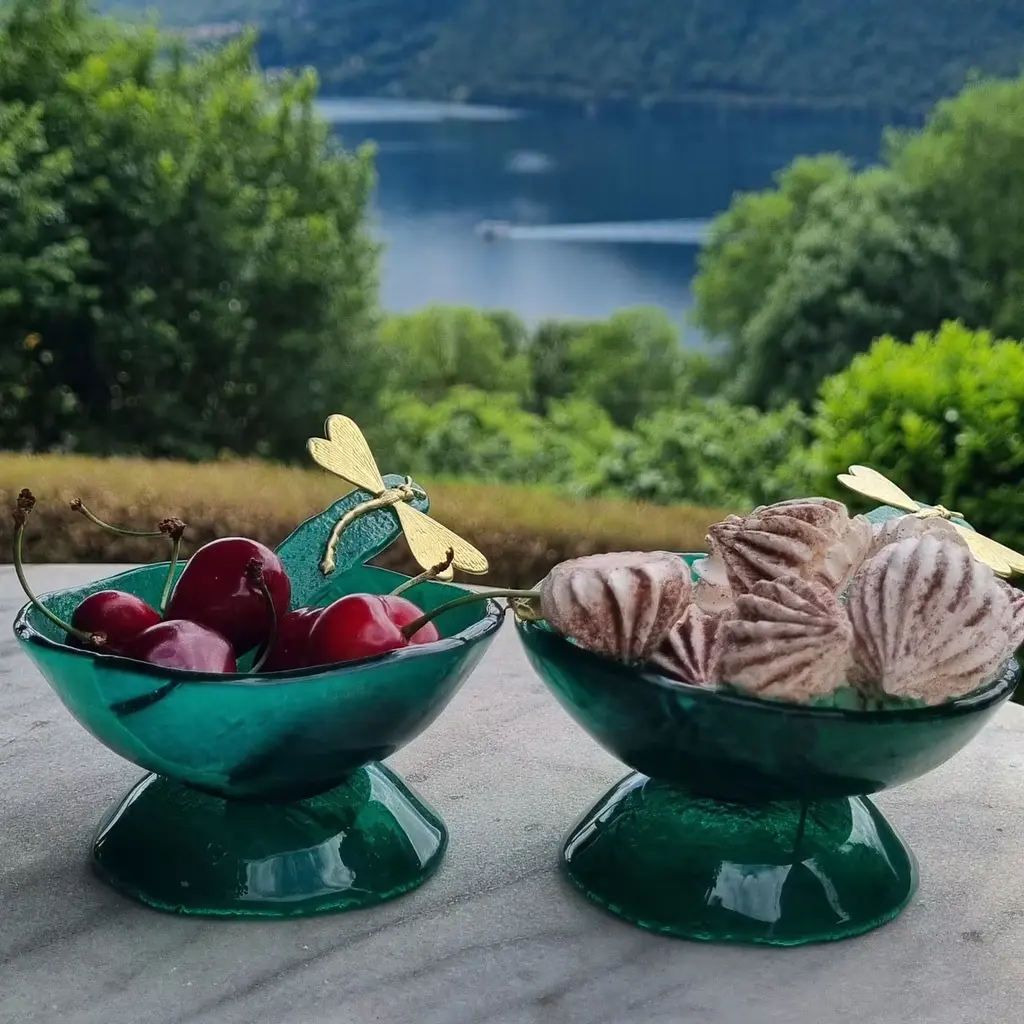 Showcasing a vibrant green hue, this stunning set of two salt cellars will be a versatile table accessory in refined indoor or open-air settings. Designed by Daniela Poletti and skillfully hand sculpted in superb Murano glass, the bowls feature delightful pedestal bases and exquisite brass dragonflies adorning each matching spoon. A perfect housewarming gift, which may also be matched with similar elements for a captivating chromatic effect. Measure 9cm in diameter.
