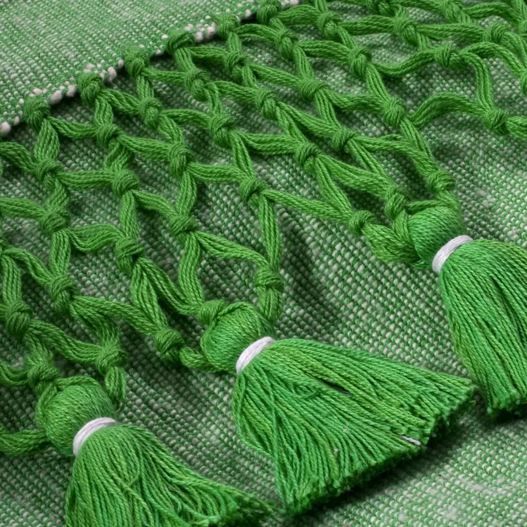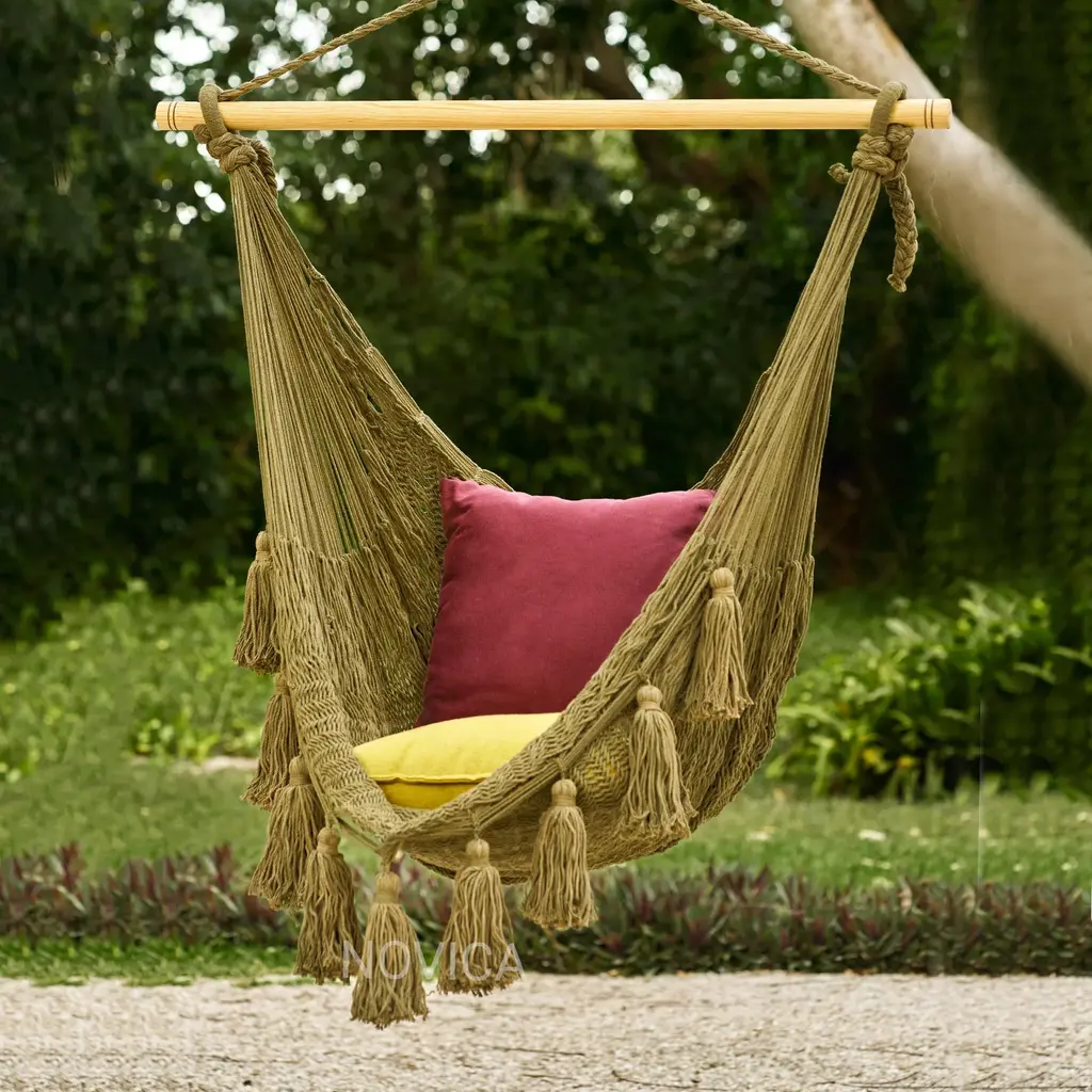 Handwoven of cool cotton on a floor loom, this lovely hammock swing holds the promise of sweet relaxation. Estuardo Cofino designs the inviting green hammock, which hangs from a pinewood rod. Lavish macrame fringe culminates with pompoms, and brass rings reinforce the hanging loops.