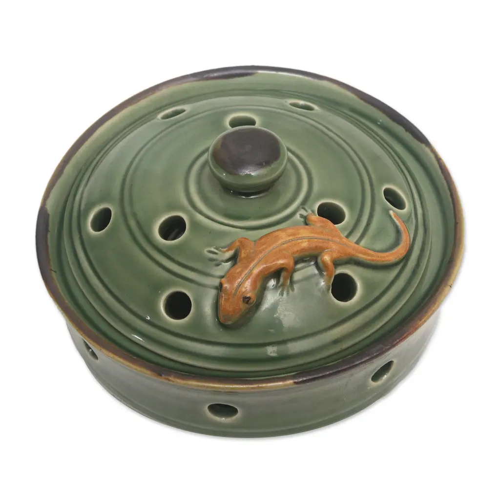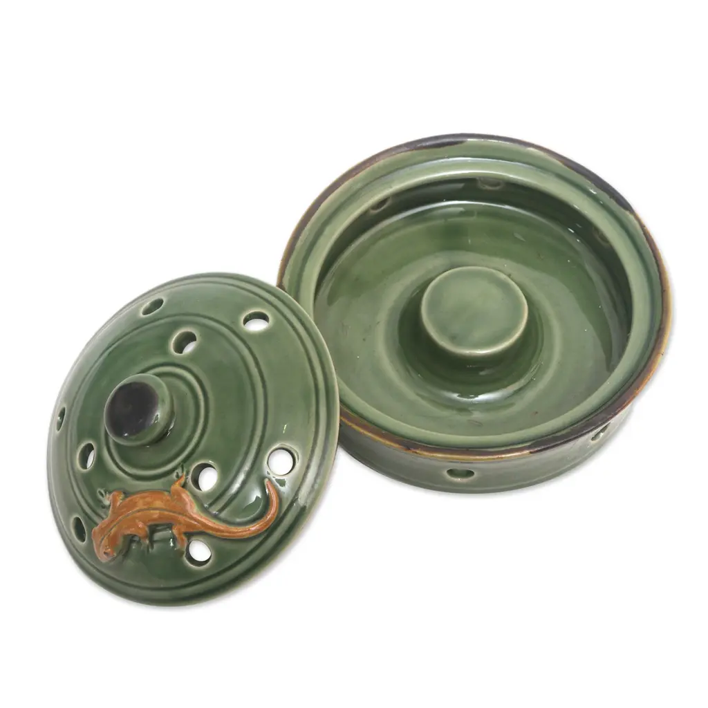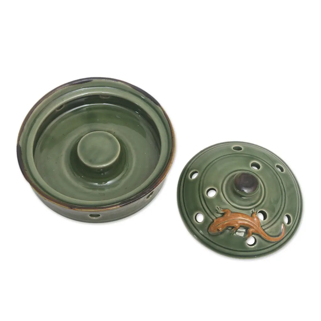 A cute lizard invites you to have a mosquito-free environment with the help of spiral-shaped incenses designed to chase away these insects. You can burn them in this green and brown mosquito coil holder, hand-crafted from porcelain with openings to let the smoke out and designed by artisan Dewa Putra in Bali.