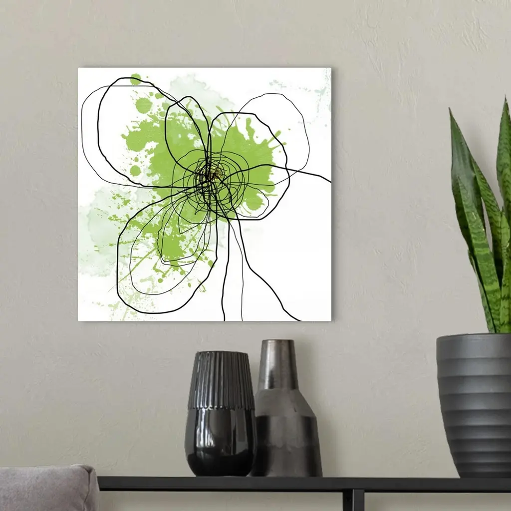 Oversized, square, abstract art of the outline of a flower illustrated with squiggly black lines and green splatters of paint beneath, on a white background.