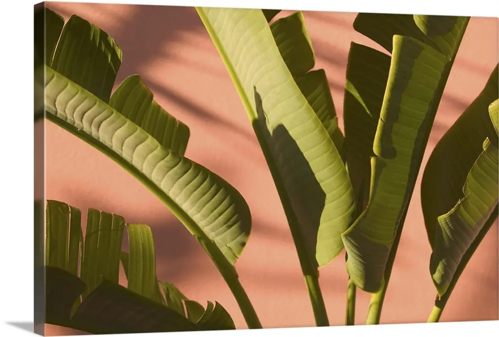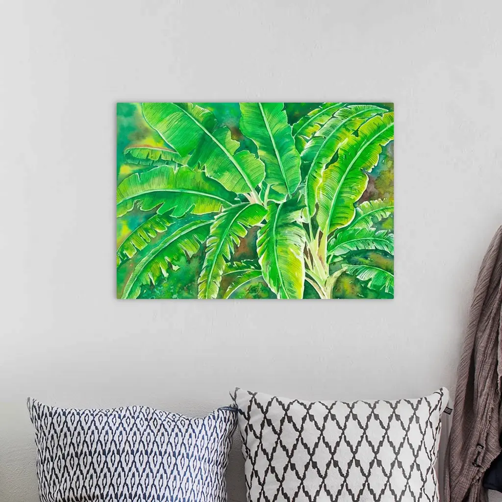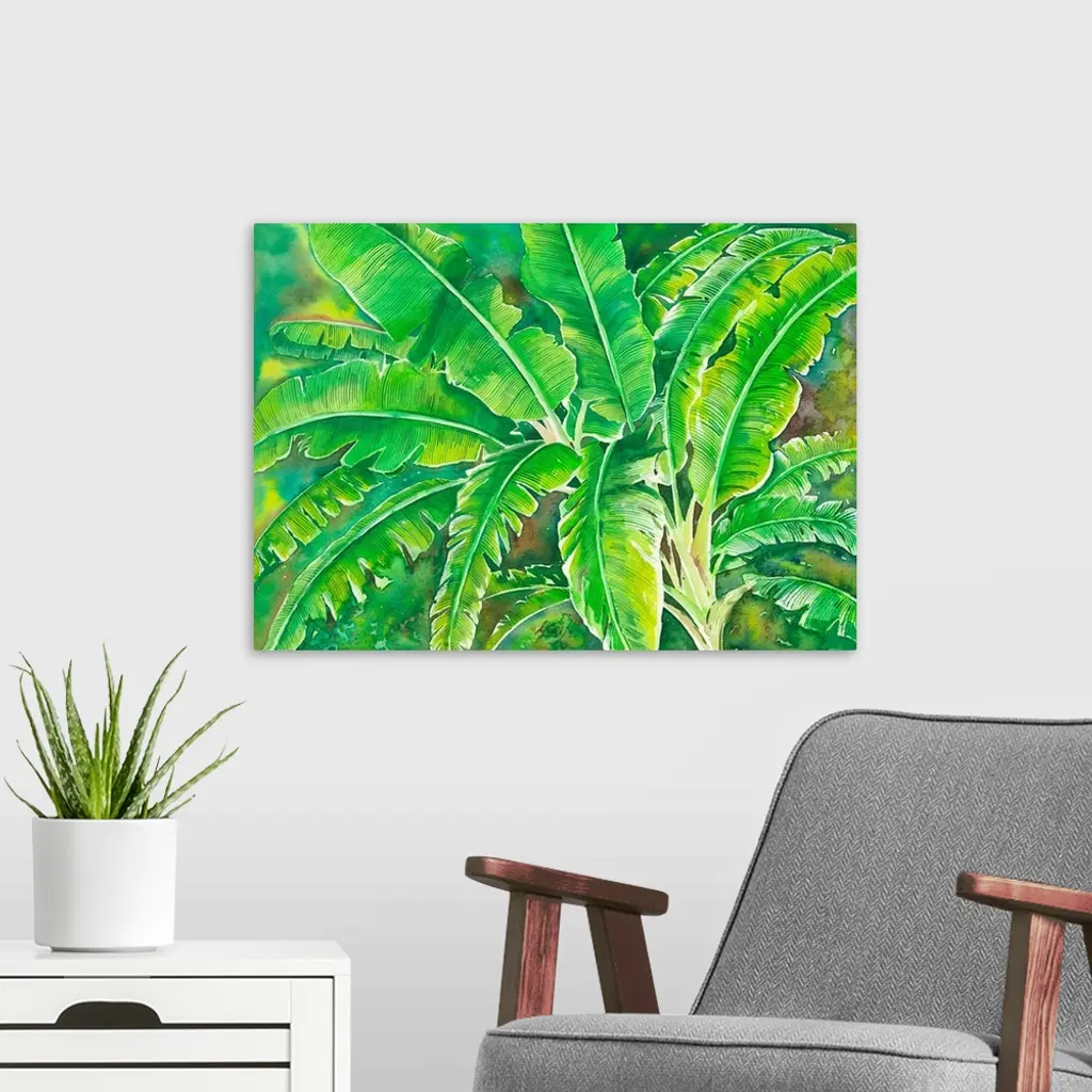 This tropical large leafy banana tree is in reach green color painted in watercolor on paper.