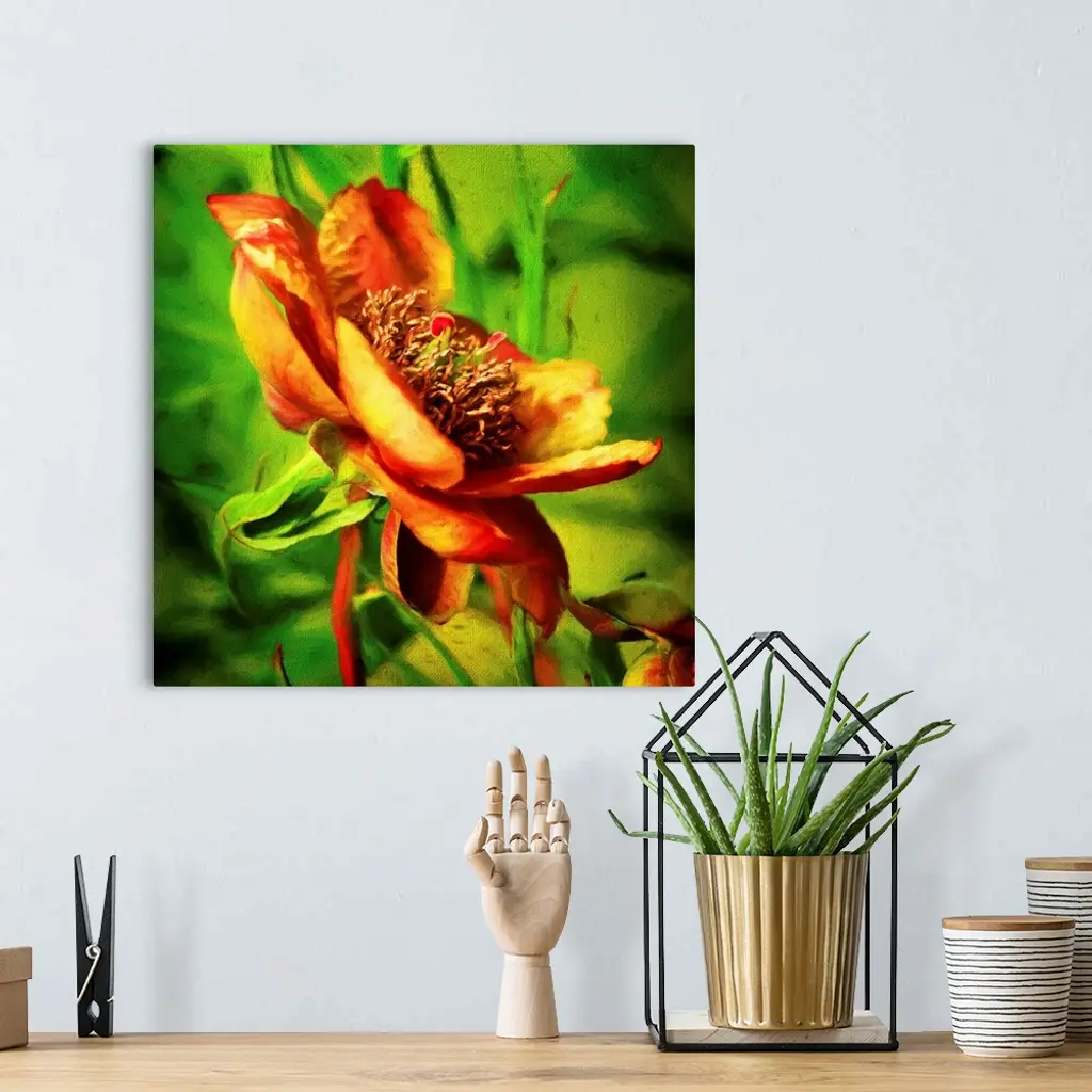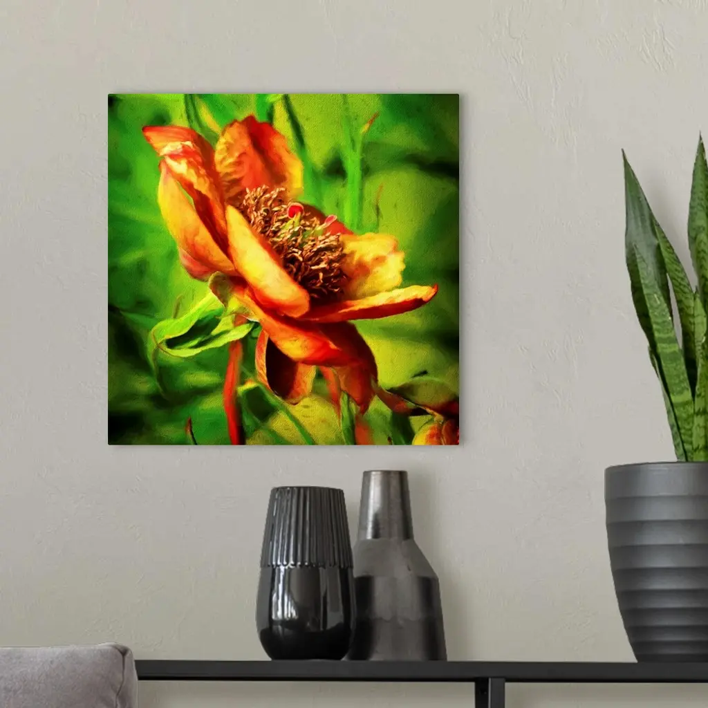 An artistic photograph of a golden orange flower surrounded by green.