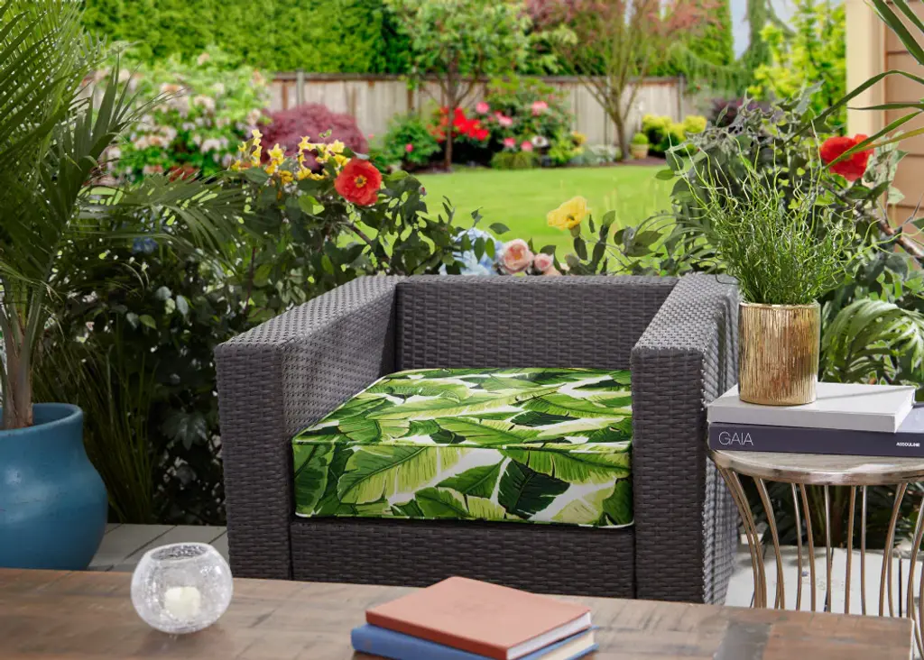 Put an exclamation mark on your patio or garden furnishings. Bright and beautiful, this outdoor chair cushion adds to the comfort level experienced by family and guests. Pure recycled polyester fiber is wrapped with soft and durable outdoor fabric that resists fading and mildew caused by exposure to sun and moisture. The cushion features a zipper enclosure for easy removal of its cover when cleaning is desired. Make a statement with bright color and style, and add this outdoor chair cushion to an exterior space, and an inside casual spot if the part moves indoors.